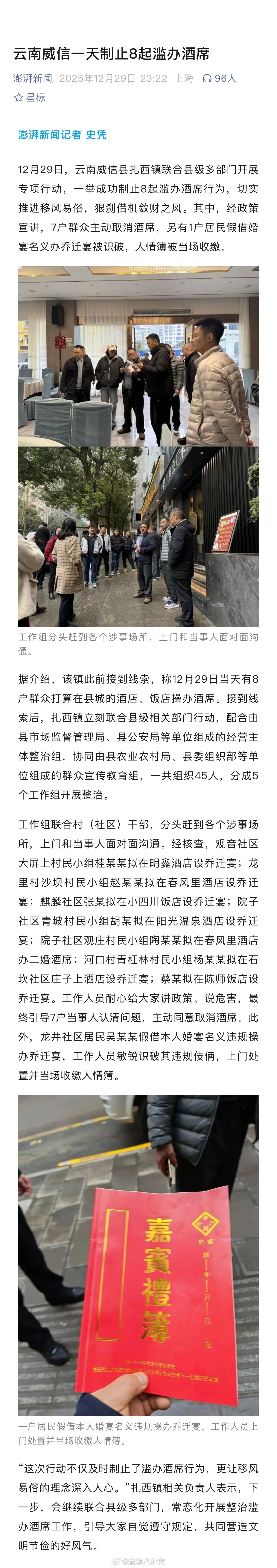 云南威信一天制止8起滥办酒席,其中7户群众主动取消酒席,另有1户居民假借婚宴名义办乔迁宴被识破,人情簿被当场收缴