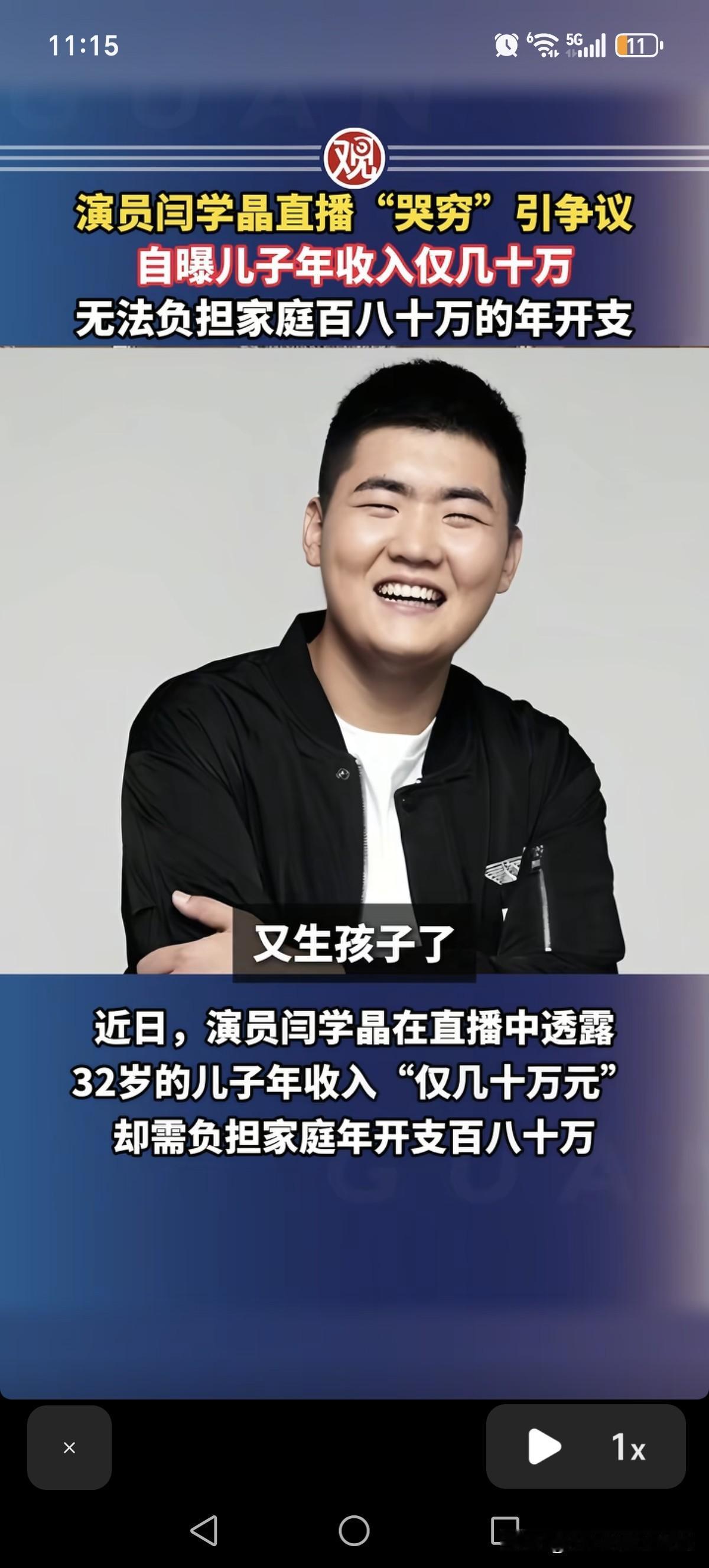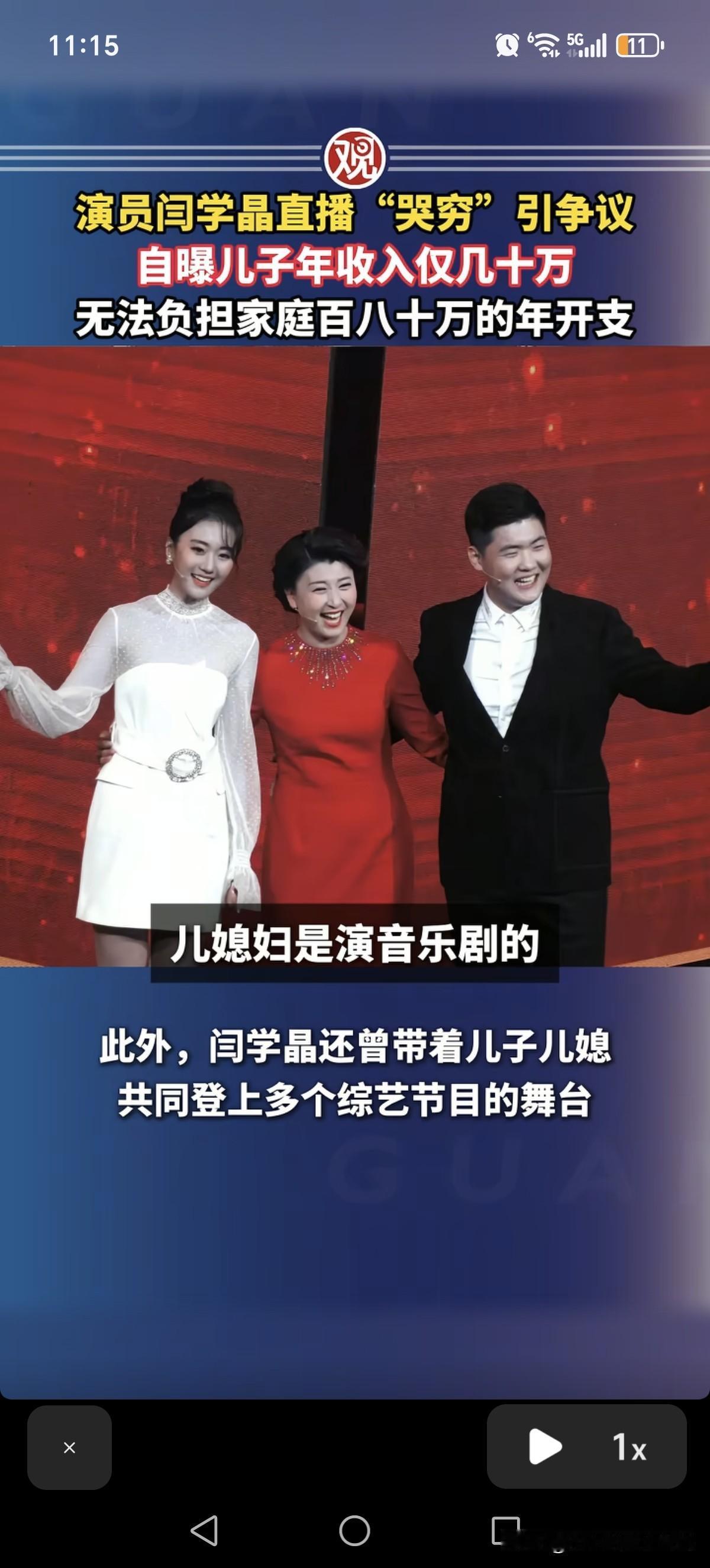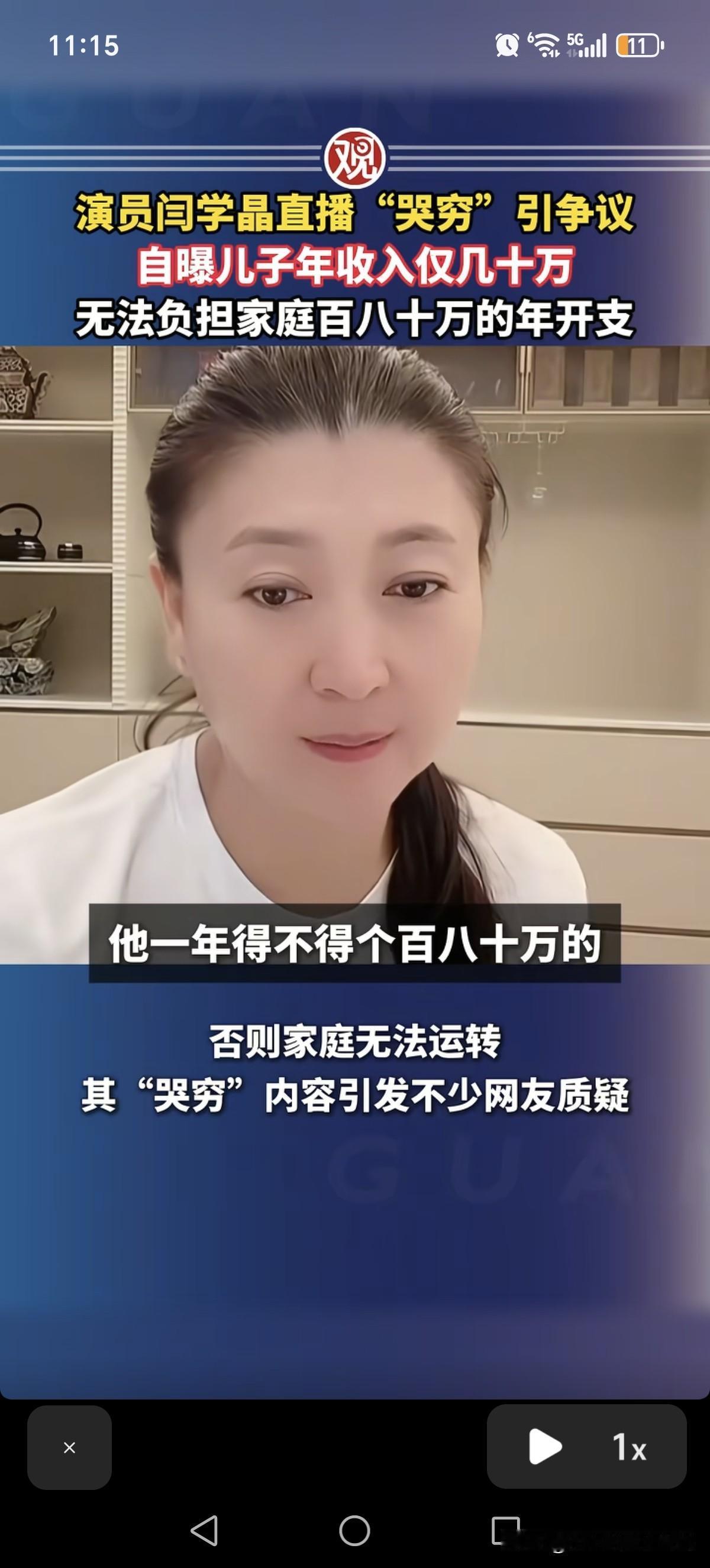 大家都去关心一下闫学晶一家人吧,他们实在太难了,他儿子32了,结了婚,家庭运转一年要100万,但是他挣不来,他去接一部戏也就几十万,而且儿媳妇演音乐剧的,也挣得不多! 这是她直播卖货的时候跟网友说的,还真敢说啊,不少老百姓一辈子都挣不到100万,他们一年就要花100万,最可恶的是还在那里哭穷,而且还一点都不遮掩说很困难,那要不要向国家申请贫困家庭,给她一点补贴?要像她那么说好多人都不用活了! 人是要脸的好不好?我说我穷的揭不开锅,闫说她三天没吃燕窝。