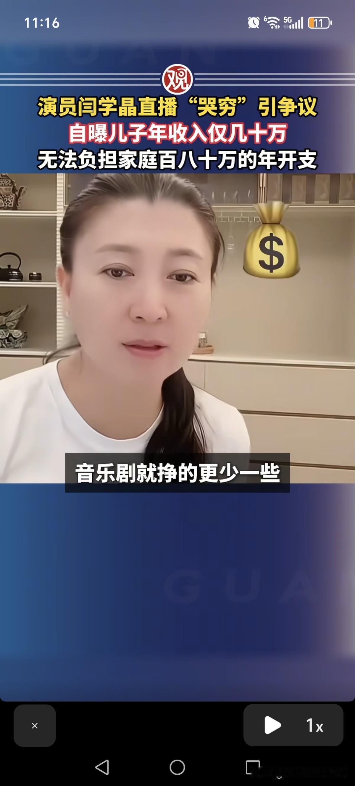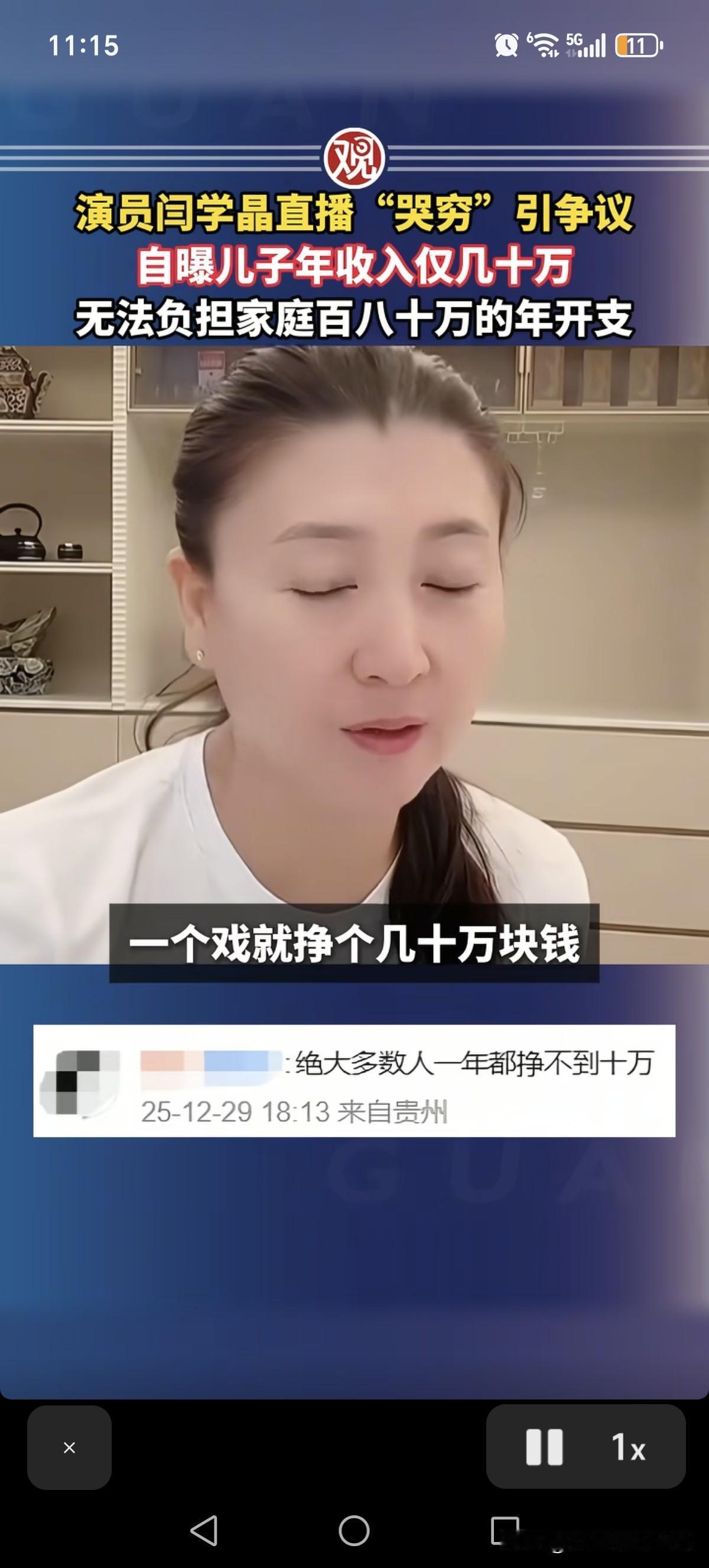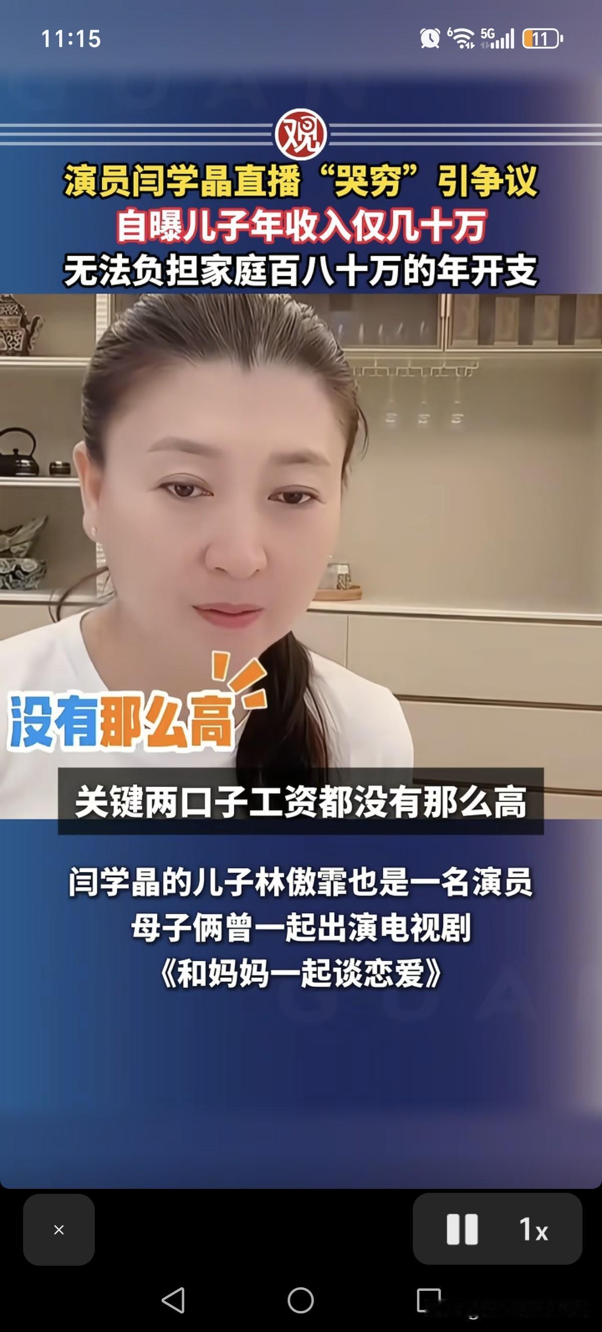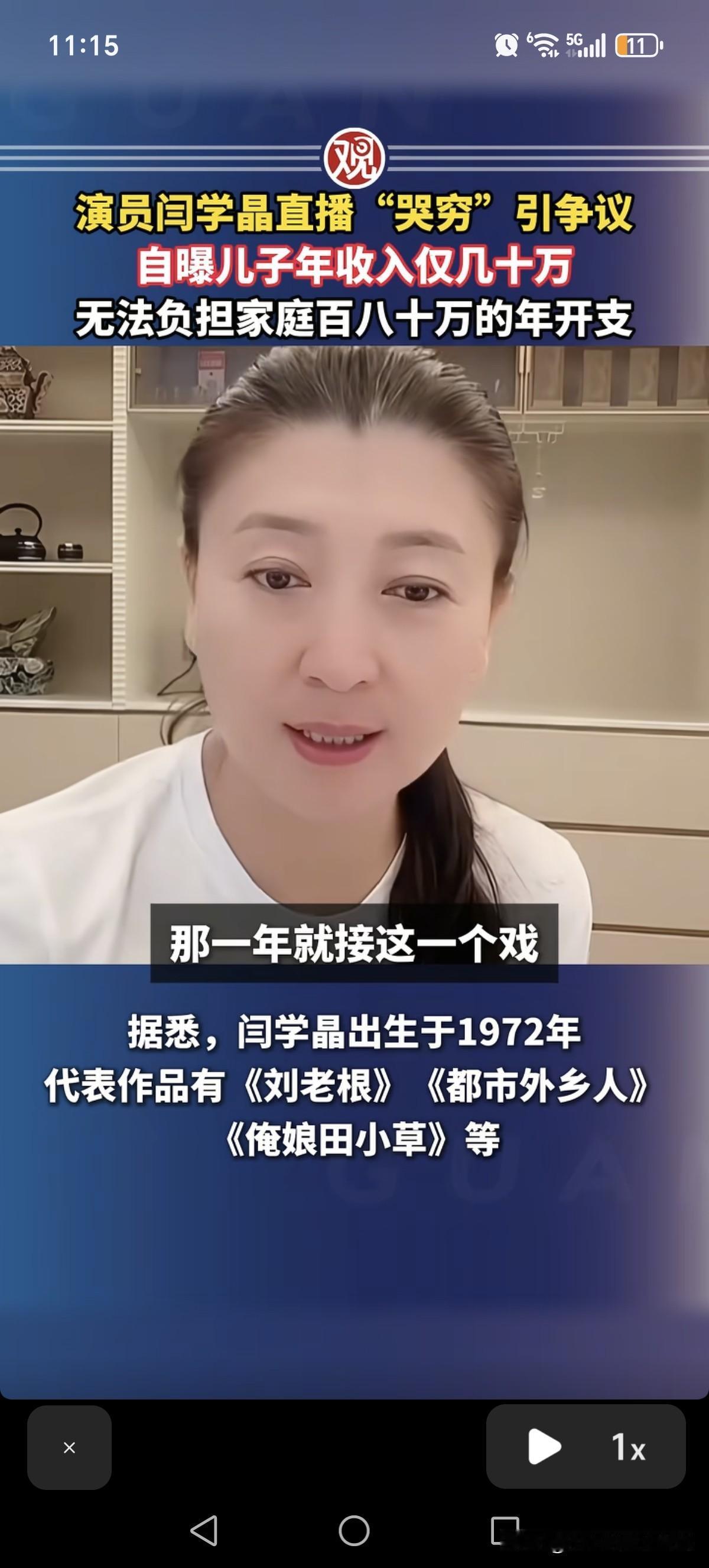 大家都去关心一下闫学晶一家人吧,他们实在太难了,他儿子32了,结了婚,家庭运转一年要100万,但是他挣不来,他去接一部戏也就几十万,而且儿媳妇演音乐剧的,也挣得不多! 这是她直播卖货的时候跟网友说的,还真敢说啊,不少老百姓一辈子都挣不到100万,他们一年就要花100万,最可恶的是还在那里哭穷,而且还一点都不遮掩说很困难,那要不要向国家申请贫困家庭,给她一点补贴?要像她那么说好多人都不用活了! 人是要脸的好不好?我说我穷的揭不开锅,闫说她三天没吃燕窝。