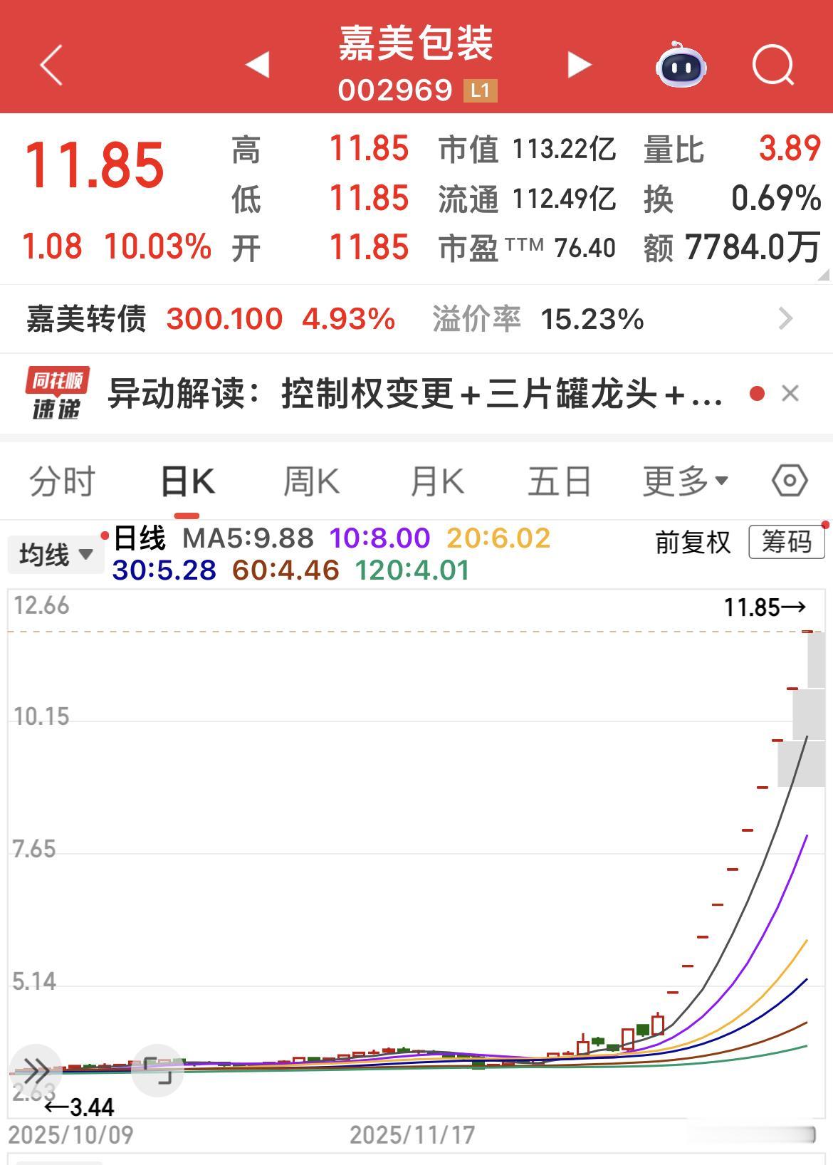 嘉美包装10连板! 控制权变更 + 易拉罐龙头 + 客户旺旺 + 海峡两岸…… 三季度净利润3916万,同比下降47.25 %。 今年总市值从40亿元炒到113亿元。