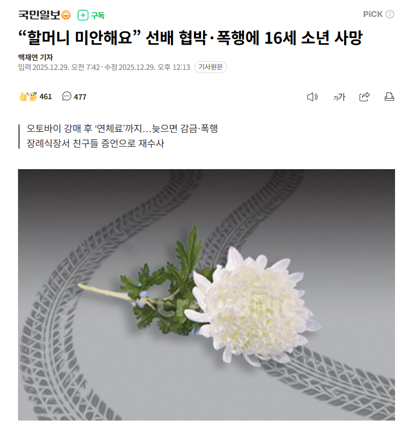 【韩国16岁送餐少年遭暴力讨债后自杀身亡,好友证言让警方重启调查揭开真相】海外新鲜事 热点现场 今年8月,在韩国庆尚北道安东,一位与奶奶同住并以送外卖为生的16岁少年,因遭受同龄学长的残忍暴力和威胁,最终做出了极端选择。据28日法律界消息,大邱地方检察厅安东支厅于上月21日,以对A某(16岁)实施殴打、威胁、监禁、恐吓等罪名,对B某进行了拘捕起诉。A某于今年8月17日在安东市安岐洞某公寓楼顶被发现身亡。调查结果显示,加害者B某在今年7月,以70万韩元价格购入了一辆二手的125cc摩托车,之后以140万韩元的价格转手卖给了受害者A某。当时A某能筹到的钱只有70万韩元,不足的部分就通过送炸鸡外卖兼职来补足。然而,B某以钱到账太迟为由,向A某索要所谓的"滞纳费",还将A某关在汽车旅馆等地持续施暴。据查,A某将自己一天的辛苦所得悉数交出,甚至将从熟人处借来的钱也一并凑上,在一个月内向B某支付了约500万韩元。A某在去世前两天,因无证驾驶被查处,其唯一的谋生工具摩托车也被扣押。筹钱无门的A某因惧怕B某的报复,于8月19日凌晨给女友留下"转告奶奶,我对不起她"的遗言后,结束了自己的生命。据调查,A某身亡后不久,加害者B某便前往警局领取了被扣押的摩托车,又以170万韩元的价格转卖给了第三方。据悉,B某虽将摩托车卖给了A某,但因未办理过户手续,摩托车车主还是B某,所以他能够将摩托车取回。事件初期,警方认为A某的死亡是基于个人选择的单纯死亡。但在葬礼上,A某的9名朋友作证称"A某持续遭受学长欺凌",调查因此重新启动。随后通过手机取证和周边人员陈述,犯罪情况逐渐浮出水面。法院认为"存在销毁证据和逃逸之虞",因此尽管B某为未成年罪犯,仍对其签发了拘捕令。