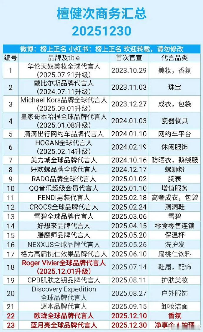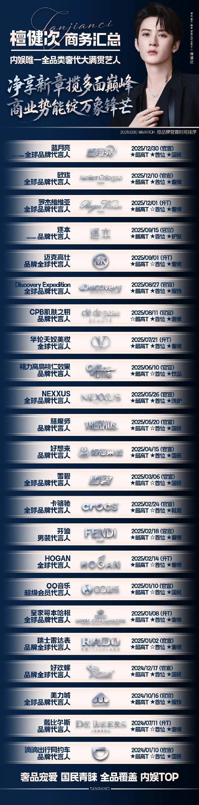 2025年是檀健次影视歌商务都丰收的一年,新增15个代言!!!今天刚官宣第23个全球代言蓝月亮,国民品牌和高奢他都有,恭喜檀健次!!!👊🏻👊🏻👊🏻