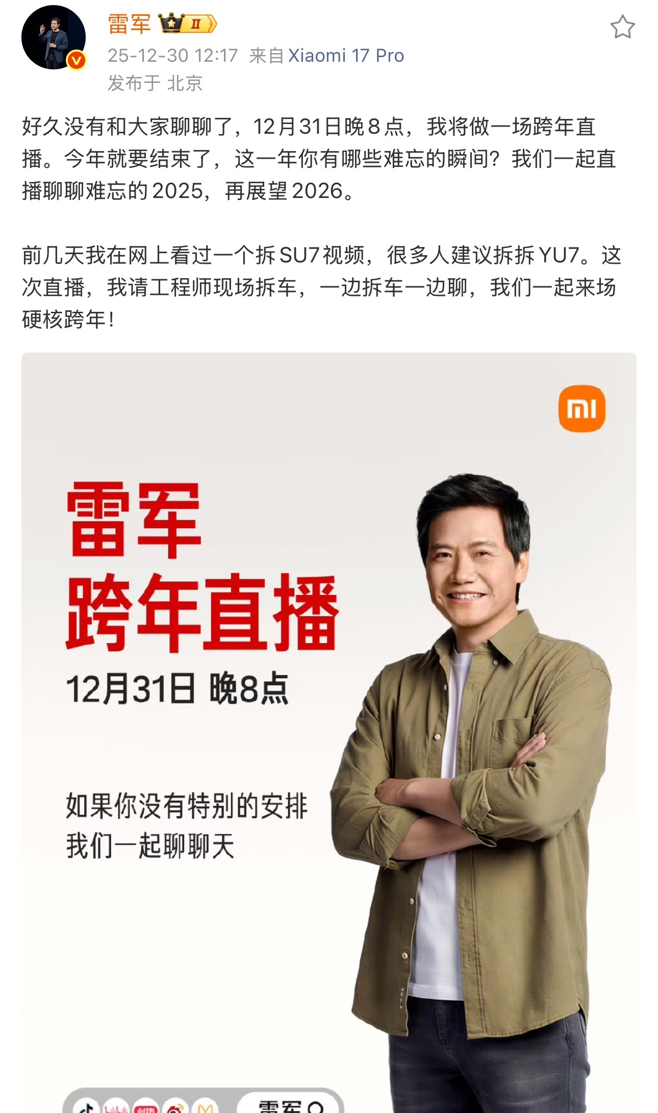 很久没看到雷总了,跨年直播拆YU7…另外,YU9是不是该预热了…