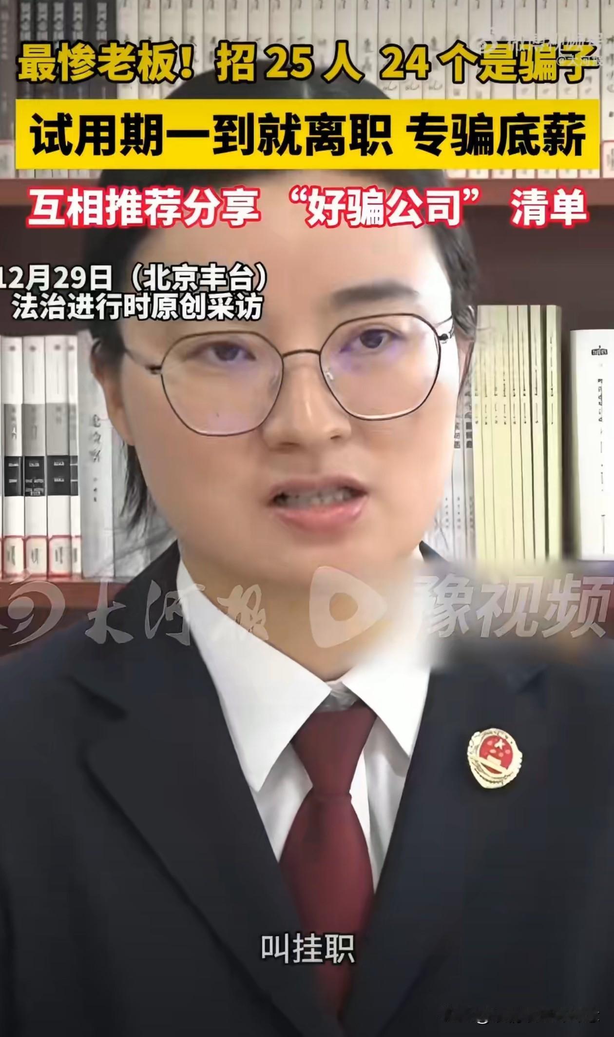 这个老板也太惨了吧, 招了25个人,有24个是骗子, 但是网友并不同情他,因为是他不想给员工交社保,才让别人有机可乘。 最近,北京一公司老板透露,自己公司招了25个人,其中24个是诈骗的,这些人就像一个“团伙”,有自己的行话,叫挂职,说白了就是去公司骗底薪,一个人找到一个“好骗”的公司,就分享出来,其他人也去应聘。 被骗的公司一般面试比较好过,出勤也没那么严格,底薪发放及时,最重要的是,他们不要公司交社保,只要底薪,还能同时入职2-3家公司。试用期一到,拿着底薪就离职了。 这事被骗的是公司,但却没人同情公司的遭遇。老板觉得自己是受害者,其实更像是“共犯”。一个想省钱,一个想骗钱,两边都在法律的空子里钻。 话又说回来,虽然法律有规定,但现在又有多少企业能做到试用期交社保?更别说什么五险一金了,打工的牛马能按时领到工资就不错了。 老板的惨,是自找的惨;骗子的坏,是钻空的坏——没有谁是无辜的。大家觉得呢?