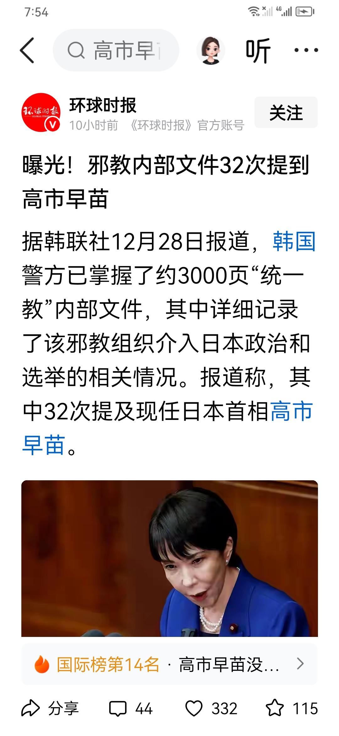 高市早苗与邪教组织统一教有瓜葛?! 该教由韩国人在日本创立,已被日本\韩国取缔,中国大陆将其列为邪教。 小泉纯一郎死于教徒某日本家庭主妇之子山本之手。 该妇将大部分家庭财产赠给教会。山本原想刺杀教主,找小泉做了替死鬼。 小泉得益该教甚多,该教组织人力\财力帮小泉及其家乡后援会在选举议员中取胜。 高市早苗受小泉重用,关系很深。 日本社会真乱,记得以前有个奥姆真理教事件。 日本的政治是一个帮派林立的局面