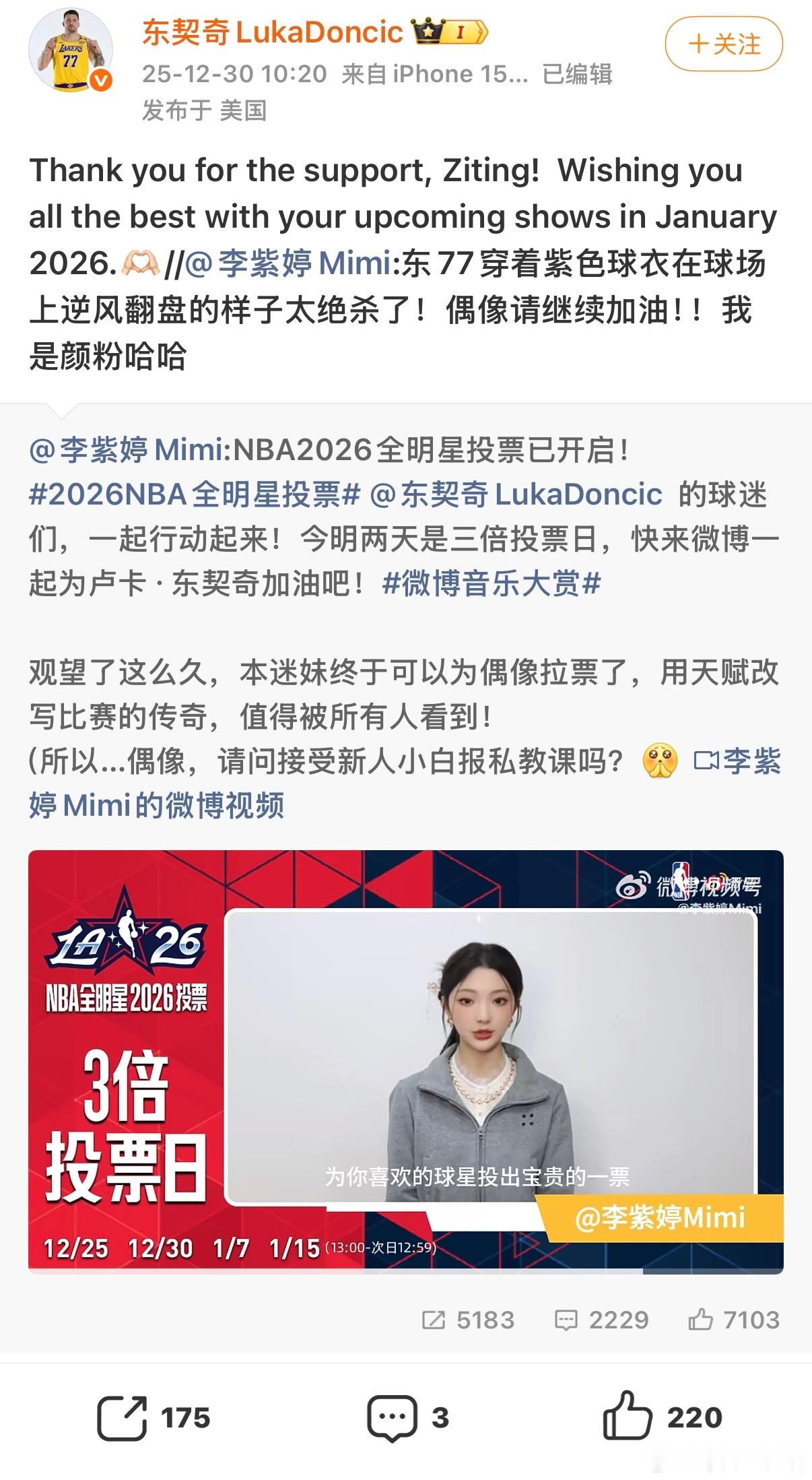 属于紫色缘分锁死!NBA三倍投票日化身东契奇“颜粉”疯狂拉票,球星还隔空期待她1.17的生日会演出,梦幻联动这就来了?李紫婷是东契奇颜粉