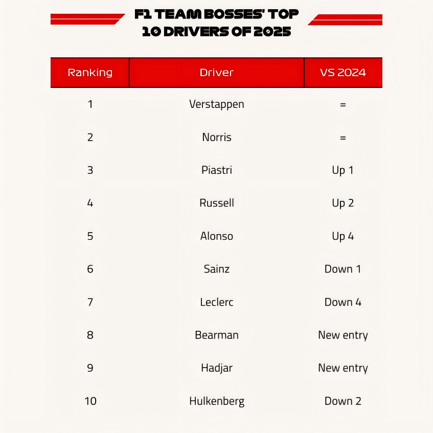 车队领队们评选出的2025赛季十佳表现车手👏十位车队领队给出了他们心目中的车手表现排名,然后F1官方按照比赛的积分系统进行分数统计。参与投票的车队领队有:迈凯伦车队领队安德烈亚·斯特拉、梅赛德斯车队领队托托·沃尔夫、威廉姆斯车队领队詹姆斯·沃尔斯、小红牛车队领队阿兰·佩尔马内、阿斯顿·马丁高级领导团队、哈斯车队负责人小松礼雄、索伯车队领队乔纳森·惠特利、Alpine总经理史蒂夫·尼尔森。F1