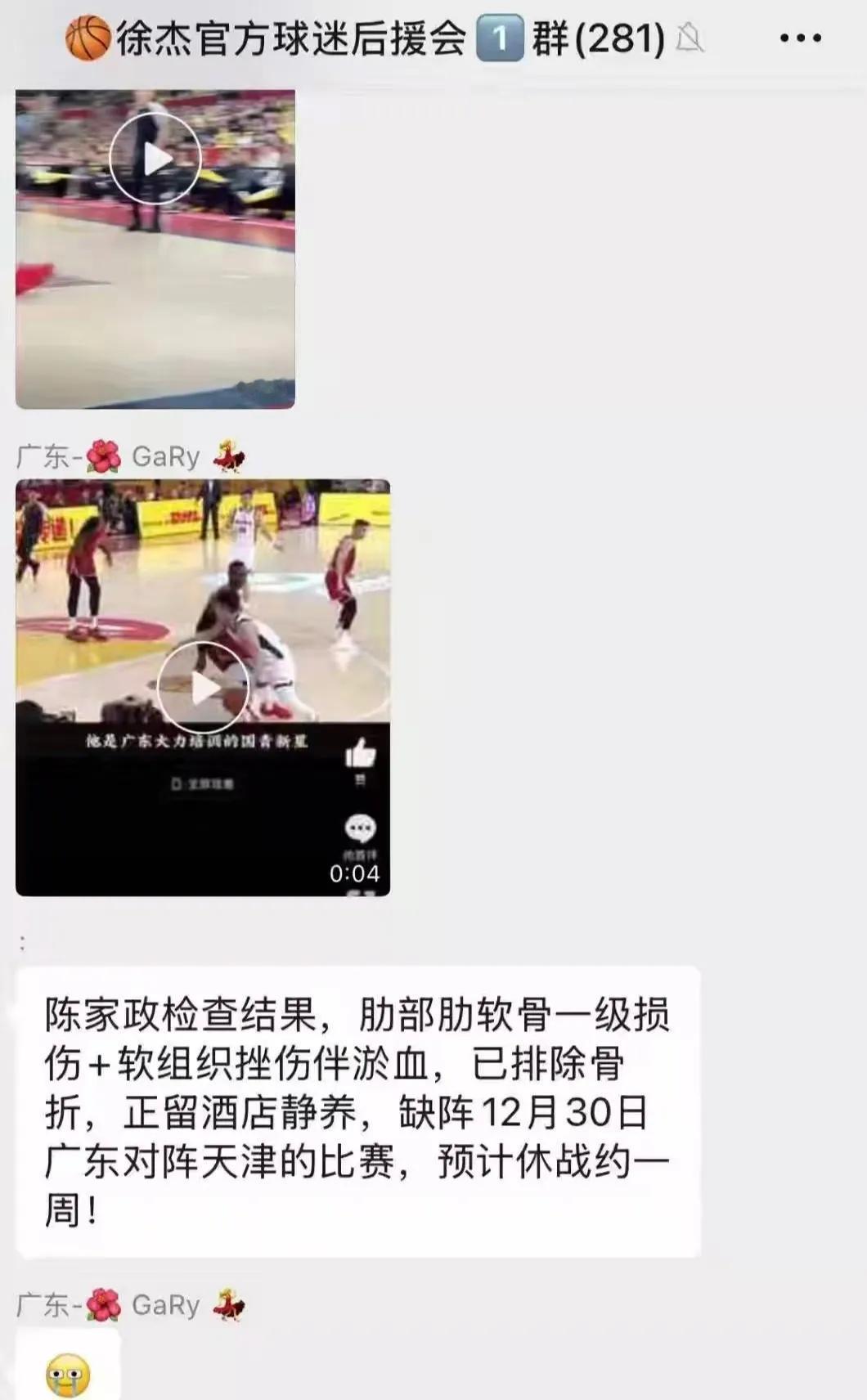可怜!陈家政被迪亚洛打伤,无法参加与天津队的比赛,真的是遗憾… 根据最新消息了解!广东队球员陈家政,检查结果也是出来,确定为肋部肋软骨一级损伤+软组织挫伤伴淤血,已排除骨折,目前正在进行静养! 考虑到他的伤病情况,他将会无缘12月30日广东队对阵天津队的比赛。 至于他什么时候可以复出,预计在一周之后! 在此也是希望陈家政早日康复,加油! 同时也是希望CBA公司可以管管迪亚洛,他不是在打球,而是在打人!