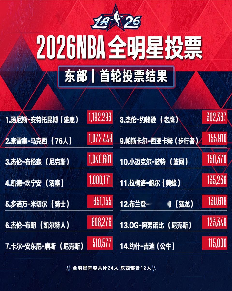 看来力度还不够啊今早,NBA官方公布2026年全明星投票的首轮球迷投票结果,卢卡-东契奇成为首阶段票王,扬尼斯-安特托昆博领跑东部。东契奇以1249518票领跑所有球员,尼古拉-约基奇(1128962票)、斯蒂芬-库里(1031455票)、谢伊-吉尔吉斯-亚历山大(878621票)和维克托-文班亚马(769362票)位居前五。在安特托昆博(1192296票)之后,东部前五包括泰雷斯-马克西(1072449票)、杰伦-布伦森(1040601票)、凯德-坎宁安(1000171票)和多诺万-米切尔(851155票)。