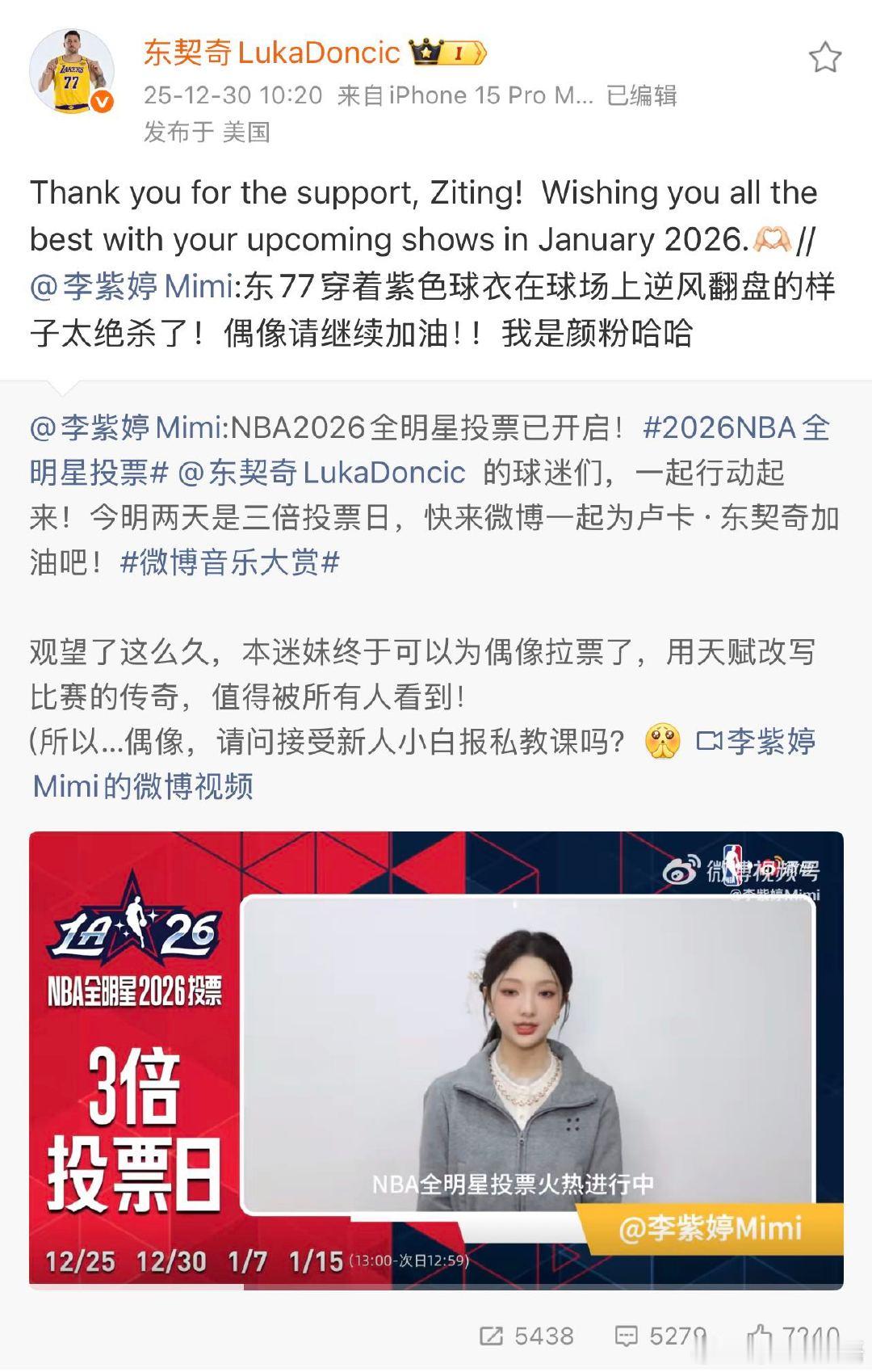 李紫婷想报东契奇私教课 谁能拒绝迷妹啊!为打call拉票还不忘求私教课,这满满的诚意太戳心 顺便期待1.17生日会,Mimi一定会带来超棒的舞台!李紫婷为湖人东契奇打call