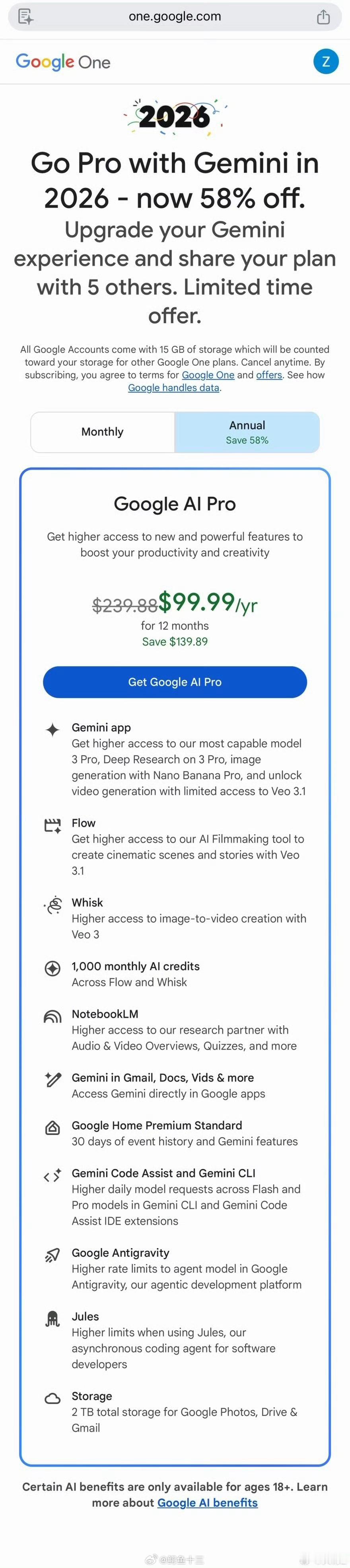 a股 跟随巴菲特的步伐巴菲特投资谷歌,我用谷歌ai,为何比免费好:1.既然投资AI,你就要用世界上最好的AI模型。2.用世界最好的模型,会对国产AI市场有一个提前的预判,至少领先3~6个月,对于普通人来说至少领先一年。3.最好的模型,有全局记忆功能,提升效率不止10倍。国产是没有的,因为算力紧缺,而且免费,无法给你提供。4.真的年费好便宜啊!留给chatgpt的时间不多了,价格战又来了!哈哈!谷歌有自己的TPU芯片,还有很强的现金流支撑,同时还有大量的数据沉淀,以及各种交叉 错综复杂的应用生态,这些ChatGPT都没有!Google AI Pro 2026 年版官方大促:年费 $239 → $99(58% OFF),包含 Gemini 3 Pro、AI 视频、编程助手、2TB 云盘,还支持 最多 6 人共享。核心权益包括: • Gemini 3 Pro(当前 Google 最强模型) • Deep Research(深度研究) • 图像生成(Nano Banana Pro) • AI 视频生成(Veo 3 / 3.1,有限额) • Flow:AI 电影制作工具 • Whisk:图片 → 视频 • 每月 1,000 个 AI 积分 • NotebookLM 高级权限 • Gemini 深度集成 Gmail / Docs / Vids • Gemini Code Assist + Gemini CLI • Google Antigravity(代理式开发平台) • Jules 异步编程代理 • 2TB 云存储(Photos / Drive / Gmail)