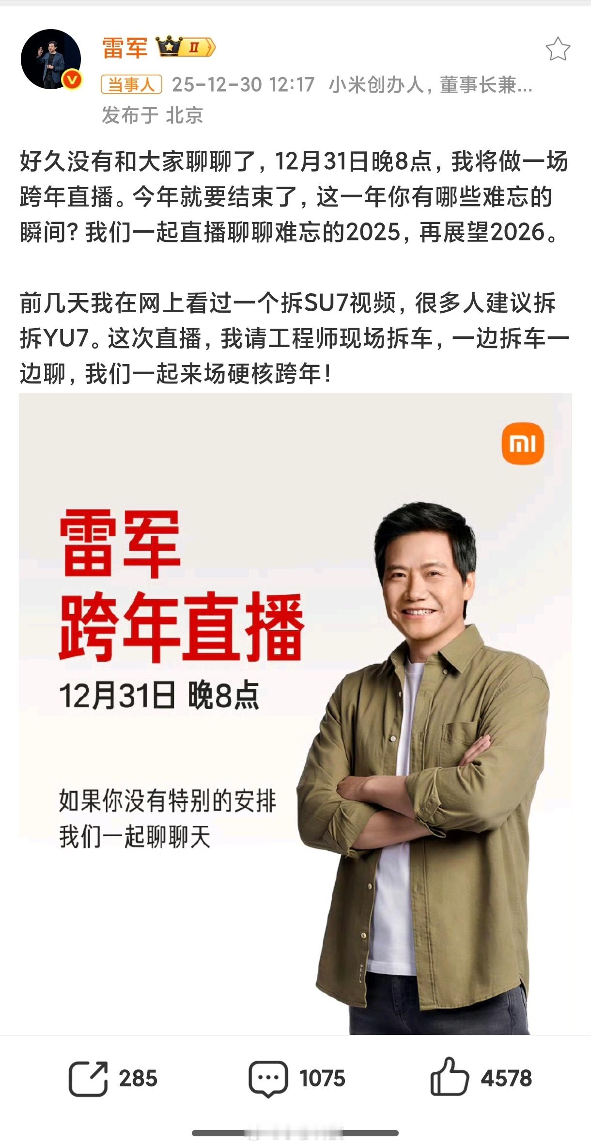 雷军跨年直播拆车雷总今年跨年整活了搞了个直播拆车的活动,我个人是非常支持各大车企高管直播拆车的活动,但是不要拿官方提供准备好的车,不然没有任何说服力原因很简单,好比和大领导下乡视察一样的道理,领导看不到真实底层疾苦,消费者自然也看不到真实的产品,有欺骗和作秀嫌疑所以建议采用交付的车,随机抽号的方式,保证产品真实性,直播真实性,检验的严谨性,这样的结果就有说服力了,黑子们也没话说,大家同意嘛雷军跨年直播拆车