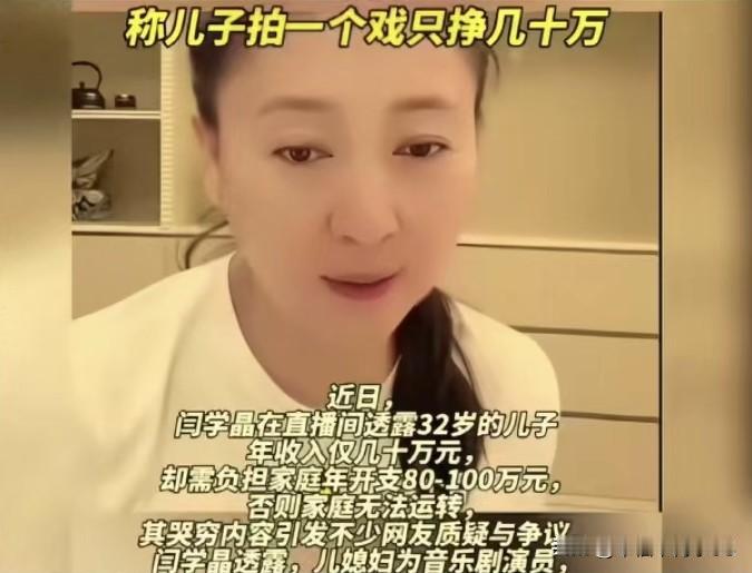 最近国家一级演员闫学晶直播哭穷,说自家一年开销得80 - 100万,儿子拍戏一年就挣二三十万,儿媳工资也不高,俩人加起来不到四十万,根本不够花。自己退休了也就五千多退休金,所以还得带病直播带货。 这“穷”得也太凡尔赛了吧!有多少普通家庭一年收入还不到20万,上班族年薪十几万的一抓一大把,谁能一年花个大几十万上百万啊。 这事儿说白了,就是明星和咱普通老百姓在收入和生活成本上的认知差太多了。他们在直播间里“明星式哭穷”,也不想想咱普通人真是离谱他妈给离谱开门——离谱到家了!