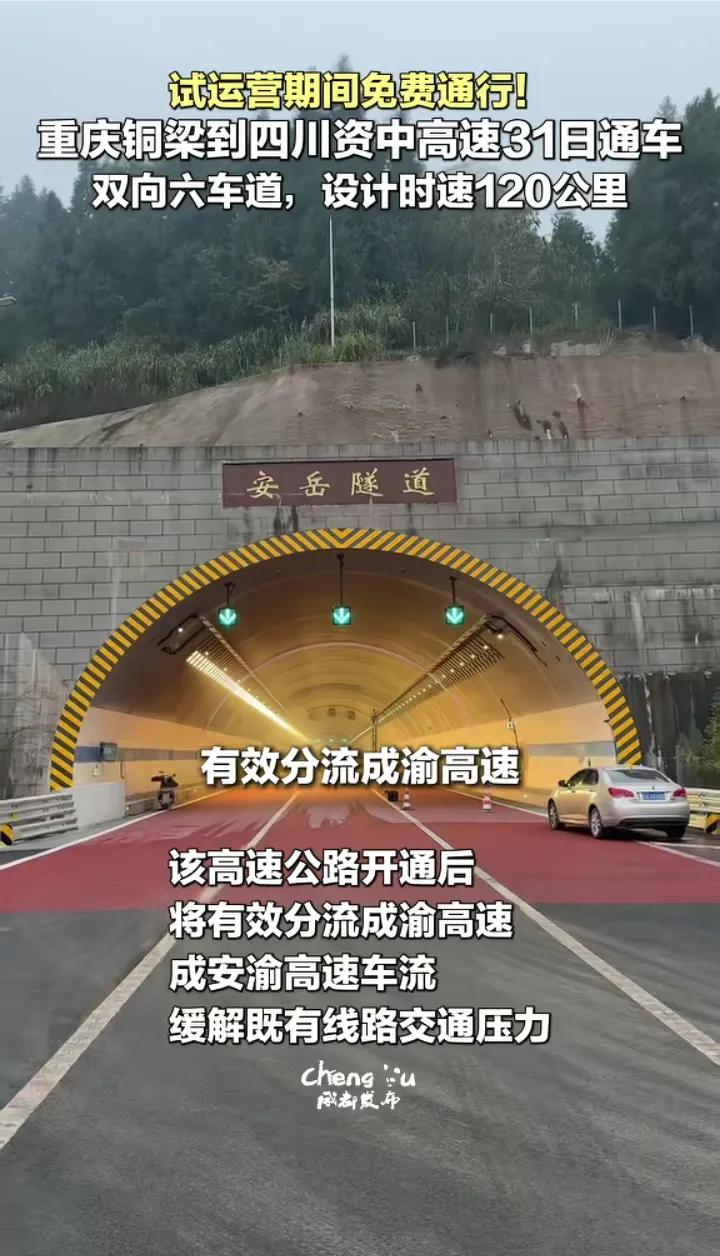 已经确定,重庆铜梁途经资阳安岳至内江资中的铜资阳高速将于明天(12月31日)正式通车,开通初期免费通行,铜资高速通车后铜梁开车来往资中将不用走S34大内高速绕行内江,西充和遂宁开车来往资中也更加便捷,铜资高速全长约105公里,双向六车道,设计时速120公里每小时,沿途主要设白塔寺、协和、大平、资中西等互通收费站,全线多为丘陵地带桥隧比较低,跑起来会更加顺畅,铜资高速的建成通车意味着川渝第17条省际大通道将正式形成,对沿途区县和乡镇的出行来往和农产品的运输能起到重要的作用,未来铜资高速还将延长至乐山绕城高速。
