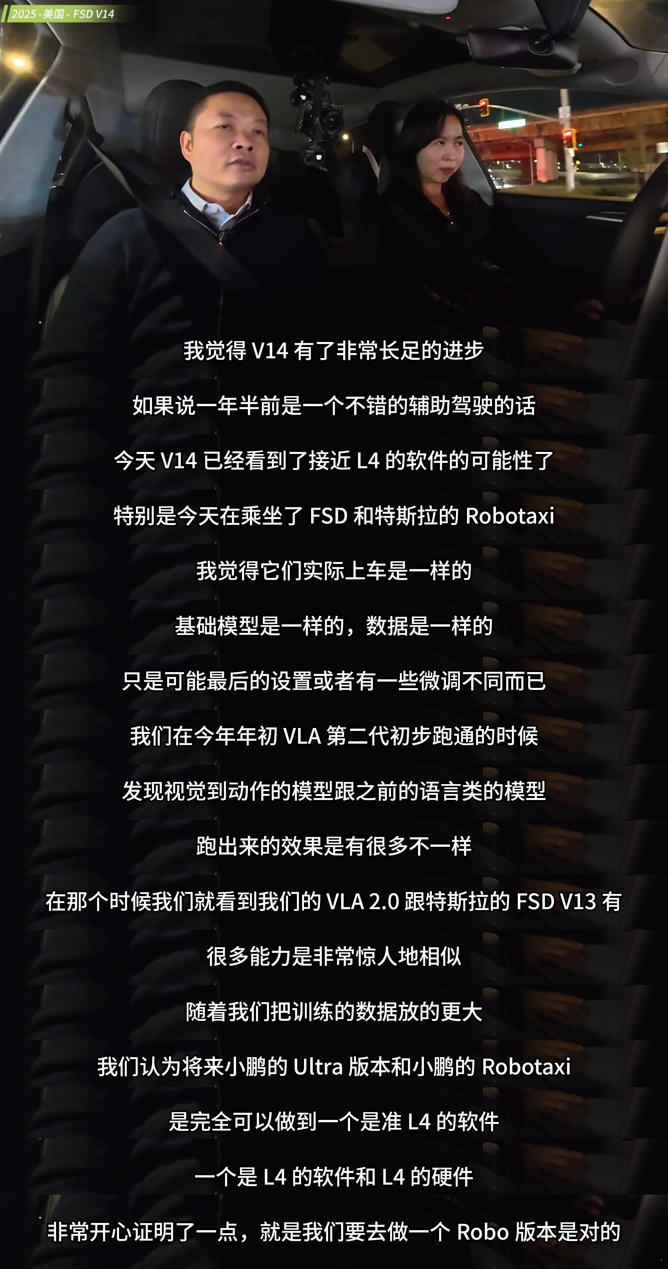 最近何小鹏再次赴美实测特斯拉FSD和Robotaxi,并坦言FSD V14已展现出接近L4的水平,已从特斯拉FSD V14和第二代VLA上感受到从L2到L4的明确路径所以回国后,何小鹏第一时间“查作业”何小鹏9大场景美国对比特斯拉 9大场景对比测试下来小鹏第二代VLA在多种场景下都能表现出高度的流畅感与安心感 目前第二代VLA将于2026年第一季度开始推送何小鹏说全力以赴憋个大招 目前小鹏与特斯拉等中美科技企业正以L4级技术驱动L2级量产车的持续进化,2026年小鹏将推出软硬件都达到L4水平的车型,有点期待了