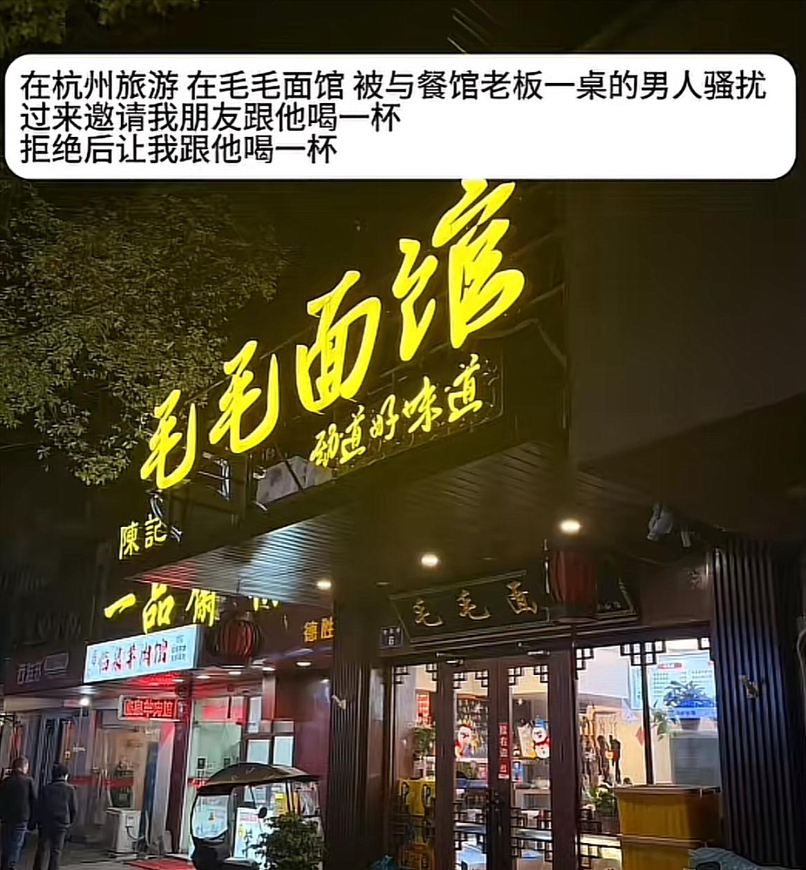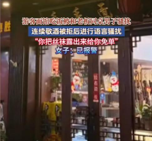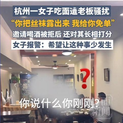 谁能想到,来杭州旅游打卡面馆,竟要遭遇这般膈应人的冒犯!女子和朋友就餐时,被老板同桌的男子言语骚扰,低俗话语刺耳至极,这份无教养的嚣张,太令人不齿! 12 月 29 日,浙江杭州,女子与朋友进店吃面。刚落座,老板同桌的几名男子就凑过来邀她们喝酒,被当场拒绝后,非但不收敛,反而变本加厉。几人回到座位,当着二人的面肆无忌惮评头论足,对她们的长相互相打分,阴阳怪气的话语让人浑身不适。女子找老板评理,可老板全程装哑巴,压根不制止。 忍无可忍准备买单时,一名男子竟扯着嗓子喊 “把丝袜露出来,这顿饭我免单”,连说好几遍,低俗到骨子里。女子当场掏出手机录像,对方还嚣张放话 “录就录,发抖音我都不怕”。事后女子果断报警,她说哪怕花费时间精力,也要让这些人知道,有些话不能随便说,冒犯要付出代价。 目前属地派出所已接到报警,正在调查处理。面馆是公共空间,不是耍流氓的地方,老板的纵容更是错上加错。