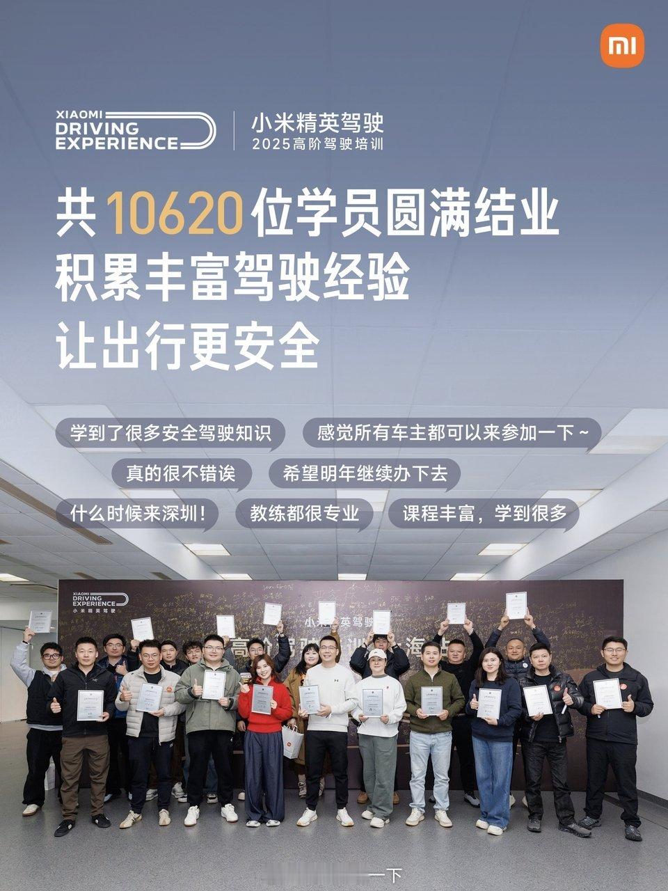从25年6月6日开始小米高阶驾驶培训1万人目标达成高性能的小米汽车更需要高技术投入去释放它的真正水平,从理论到实操,小米汽车全身心做好从造车到用车的每一个步骤,也让广大车主更了解自己的爱车,也能更安全地驾驶自己的爱车,小米精英驾驶培训今年覆盖了全国九个城市,共有10620位学员圆满结业,未来小米还能进入更多城市给更多车主带来专业培训。