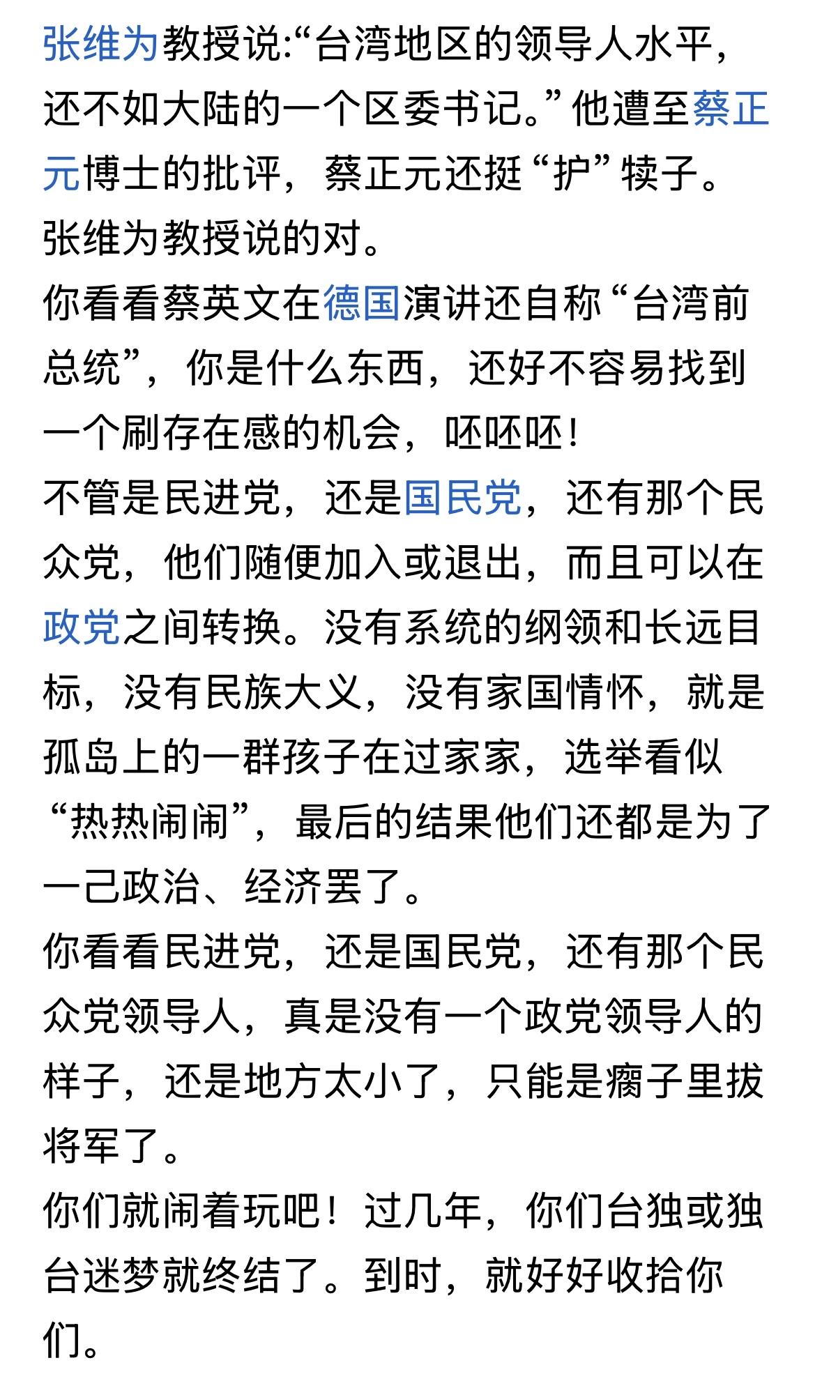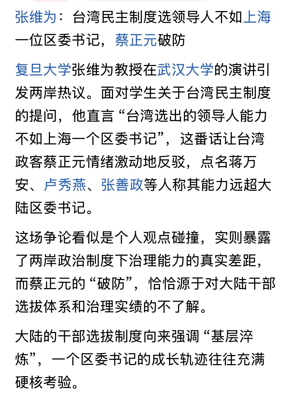 蒋万安比不上大陆地区一个县委书记,或者是办事处主任。别看他讲话这么好,再好,也没有张维为教授讲的好。