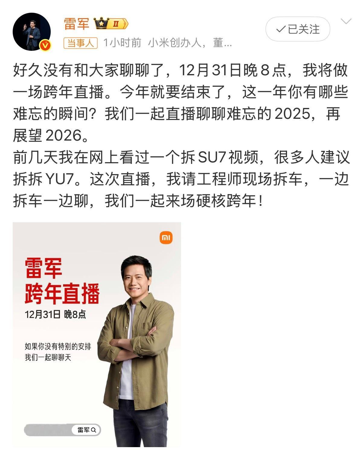 雷军跨年直播拆车明天晚上看雷总拆YU7