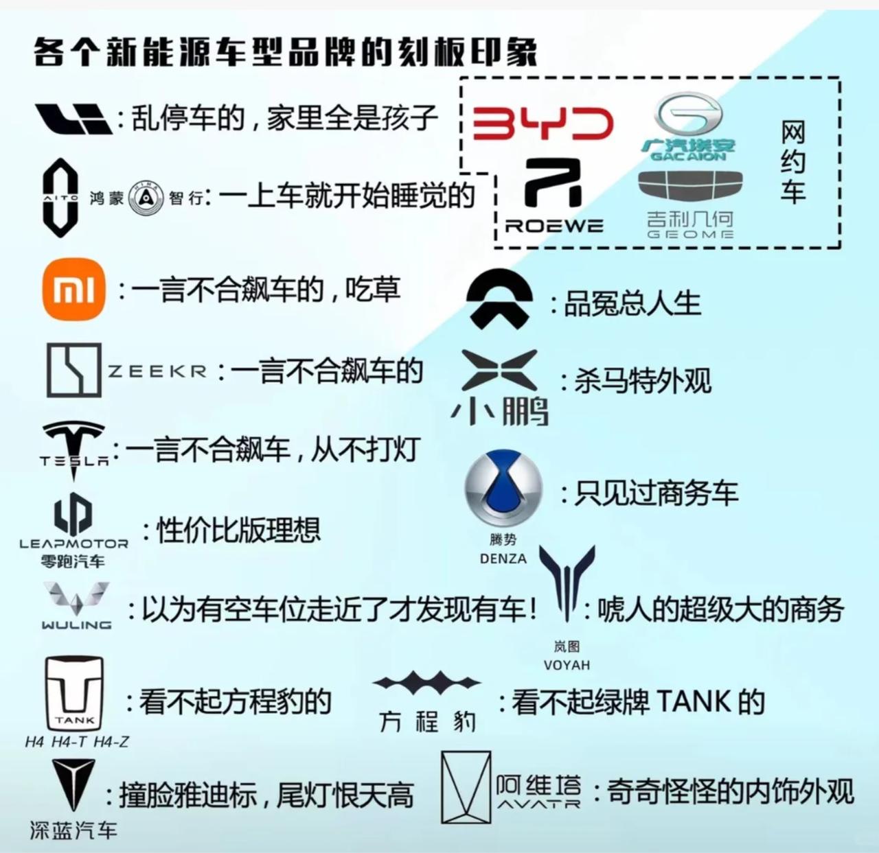你的车符合刻板印象吗? 朋友给我发了张新能源汽车的刻板印象梗图,确实有几分道理。一个黑色邪恶大鼠标一个理想,一个在马路上横冲直撞,一个在停车场乱停乱放,还是很符合刻板印象的。零跑B10在外观上确实有些撞脸理想,但不到10w就提车的价格也很香,而且总体的设计更加年轻化。蔚来就更不用说,是生是死仍是未知,希望它成功吧【来自懂车帝车友圈】