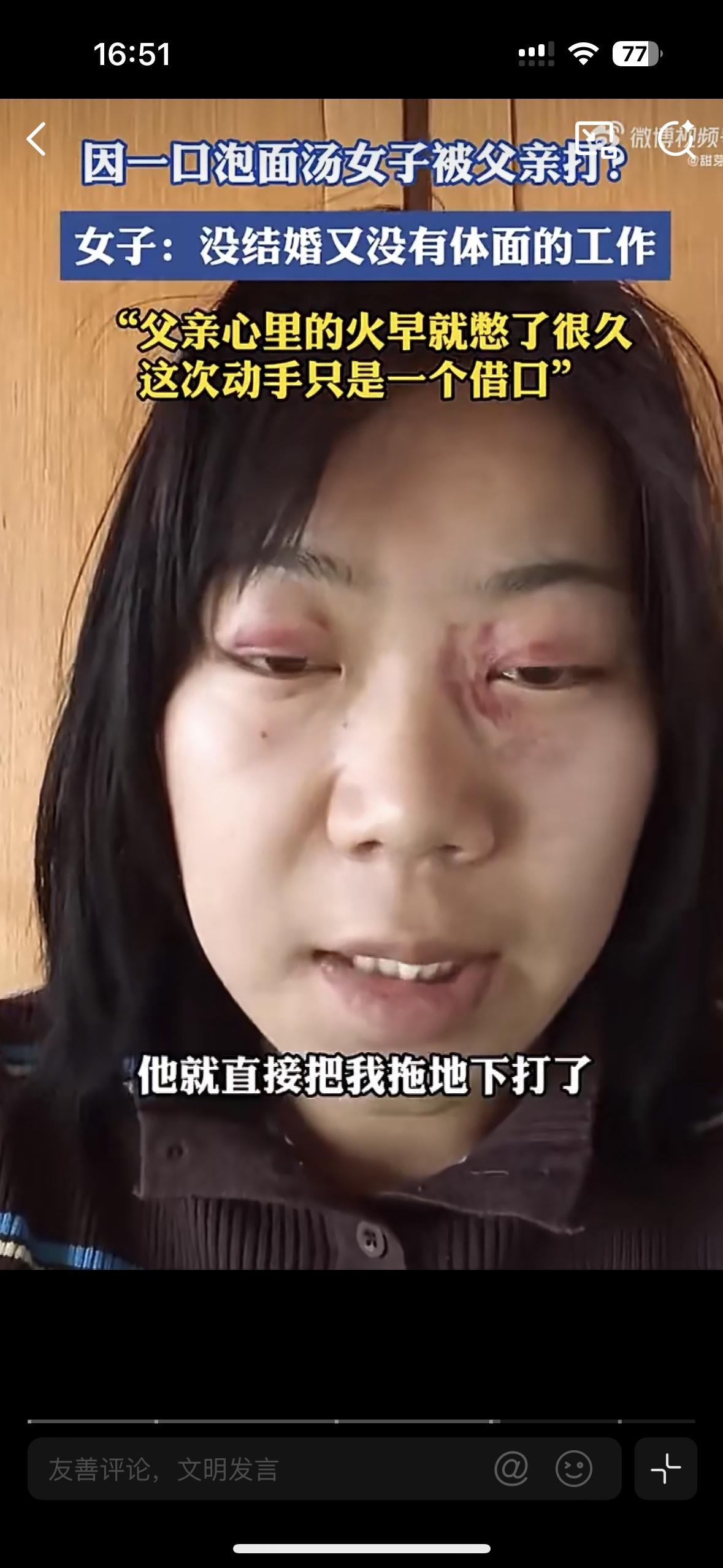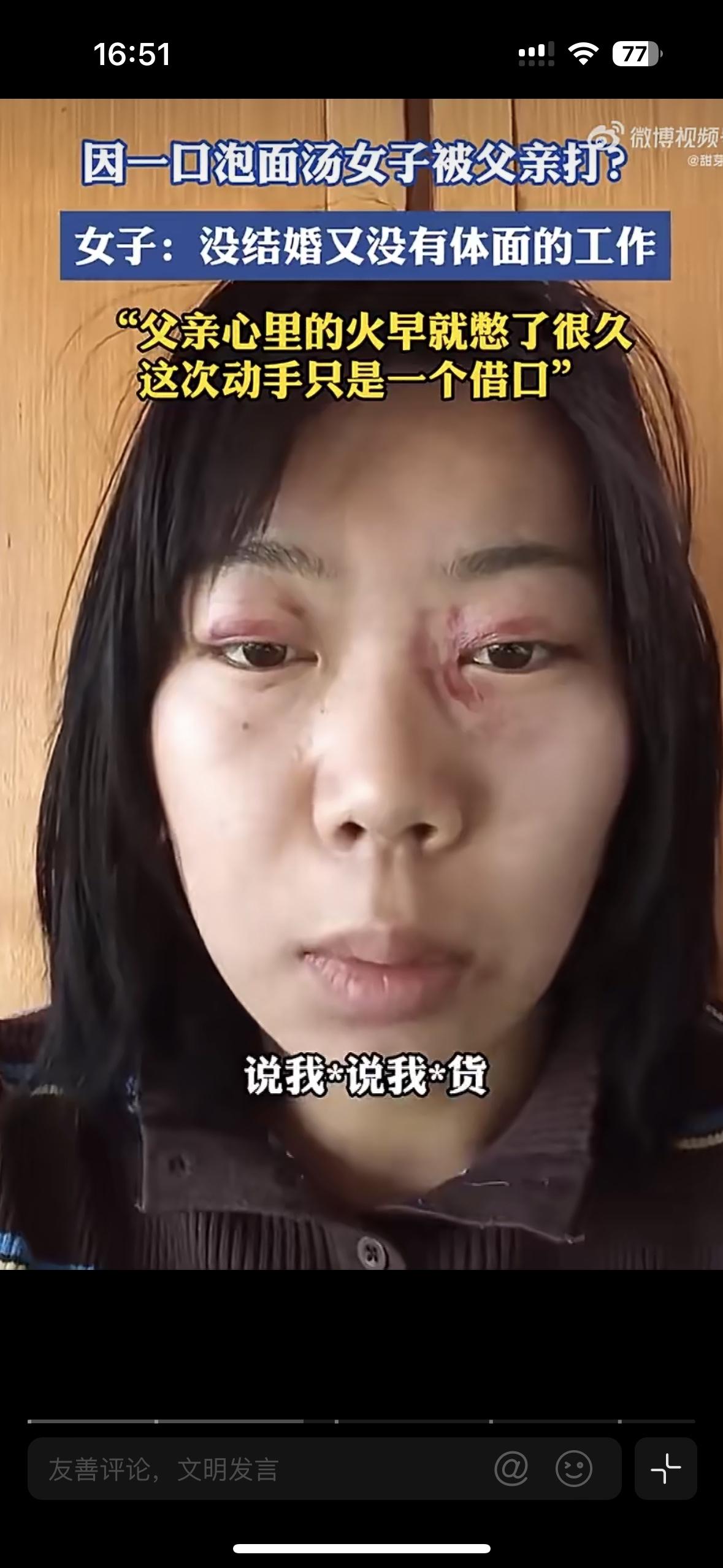 中国式的父亲能让人有多压抑?因为一口泡面汤,30多岁的女儿被打的鼻青脸肿 女儿年