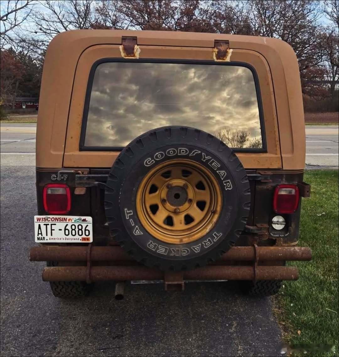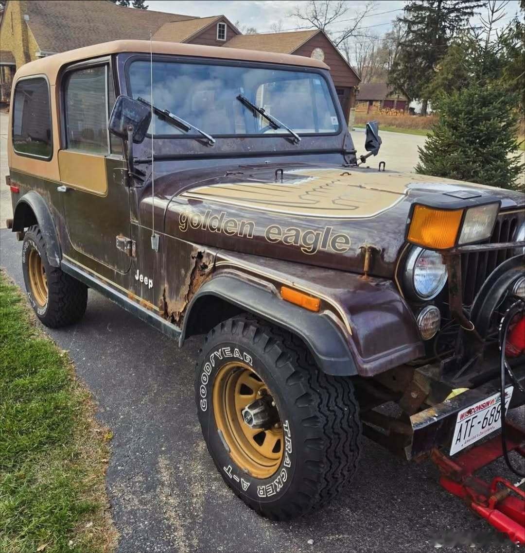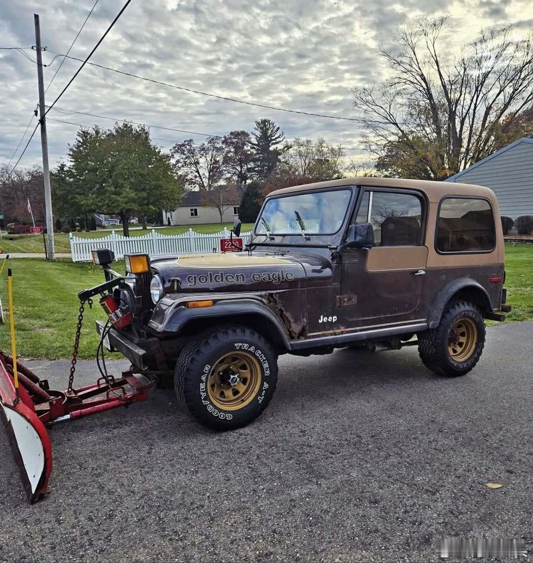 牧马人 1980 CJ-7 Golden Eagle 清雪车,车身颜色为 OM 深棕色金属漆。非常原汁原味,甚至连固特异 Tracker 轮胎都保持原样。遗憾的是,长期用于清雪和牵引作业导致车辆最终锈蚀报废。 americanjeepamcjeepgoldeneagle渐冻症