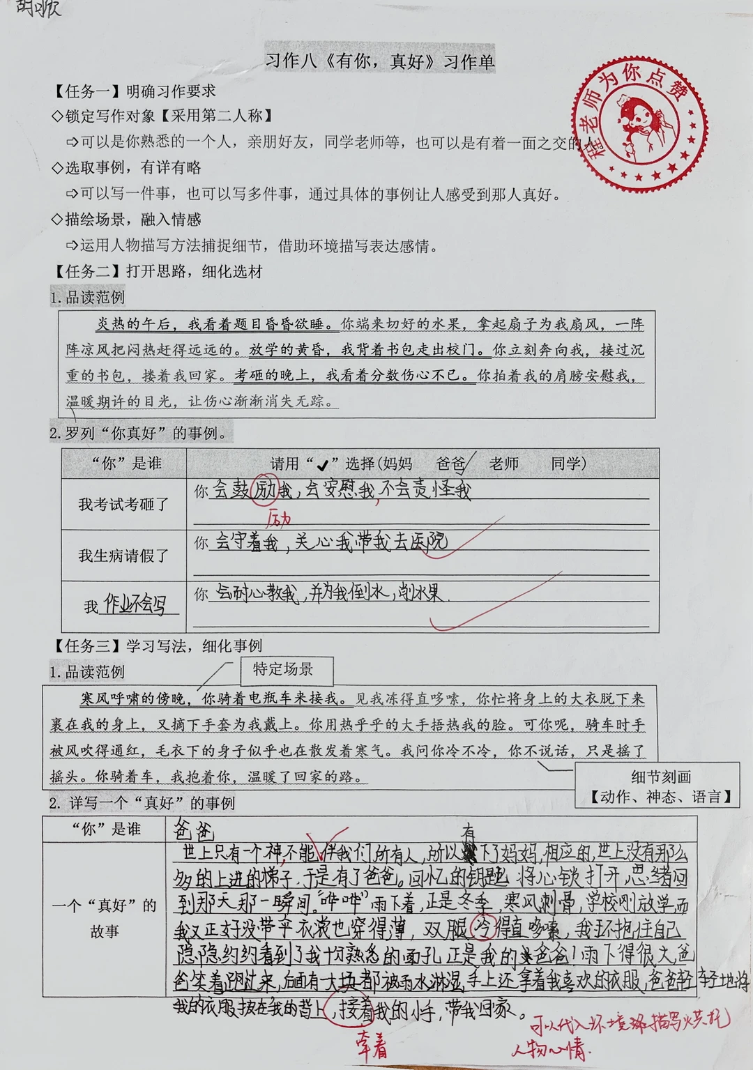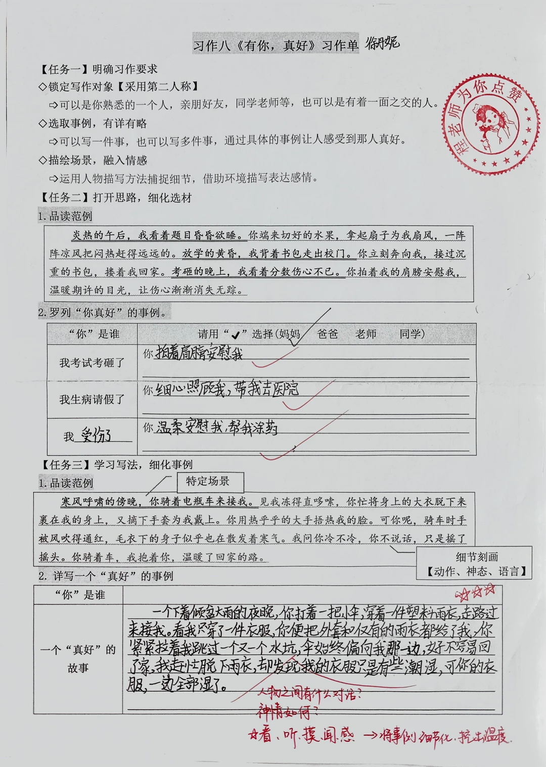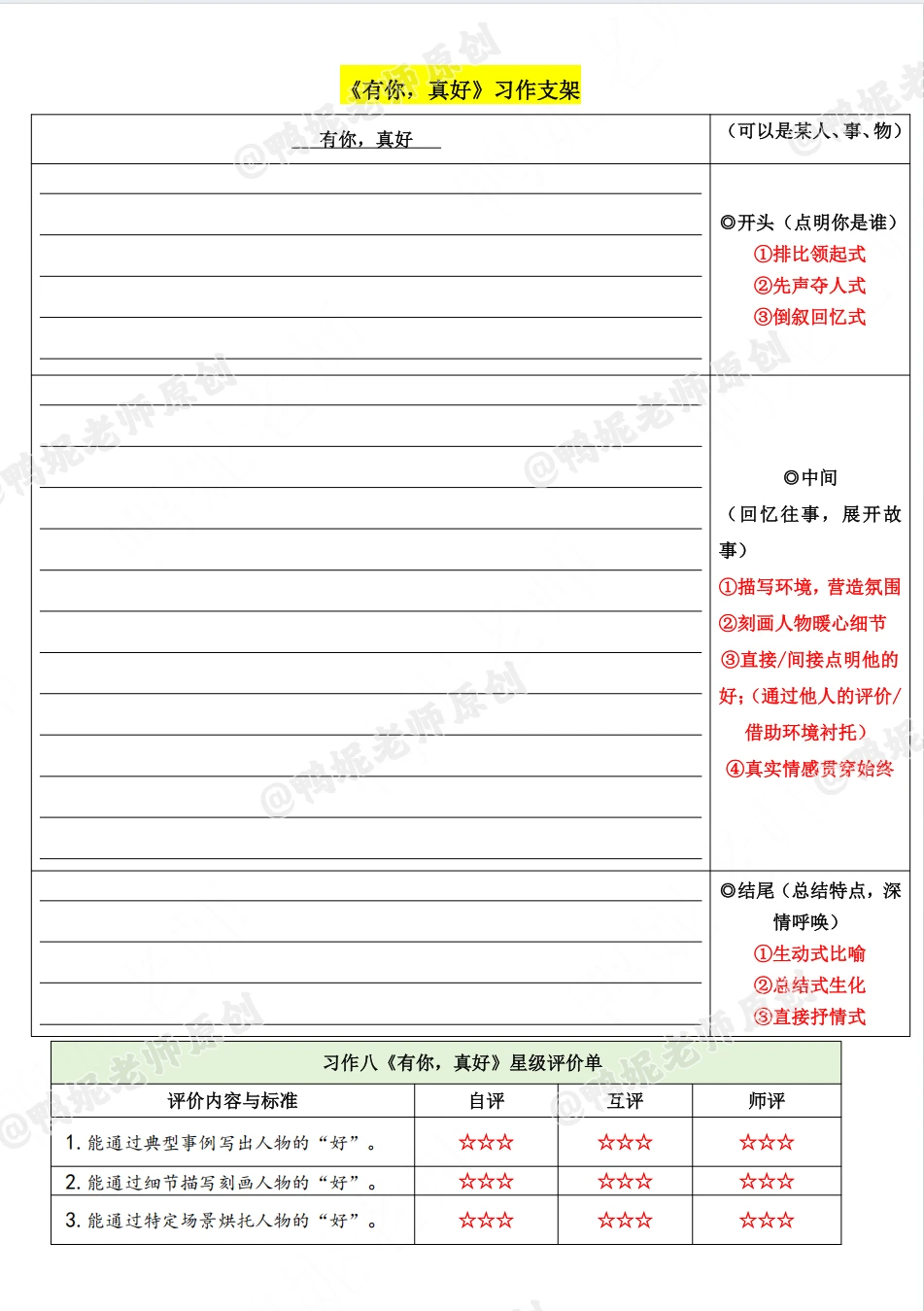这个次的习作要避免“假大空”,要把日常中的“俗事”写出细节,写出温度。 [一R]明确习作要求: ①锁定写作对象(采用第二人称) ②选区事例,有详有略 ③描绘场景,融入感情 [二R]写作小妙招: 1.抓住细节(运用动作、语言、神态等多种描写方式突出他的特点) 2.融入感情👇 ①可以直接抒情 ②借助环境描写表达感情 ③叙事中,抓住感动的瞬间表达感情