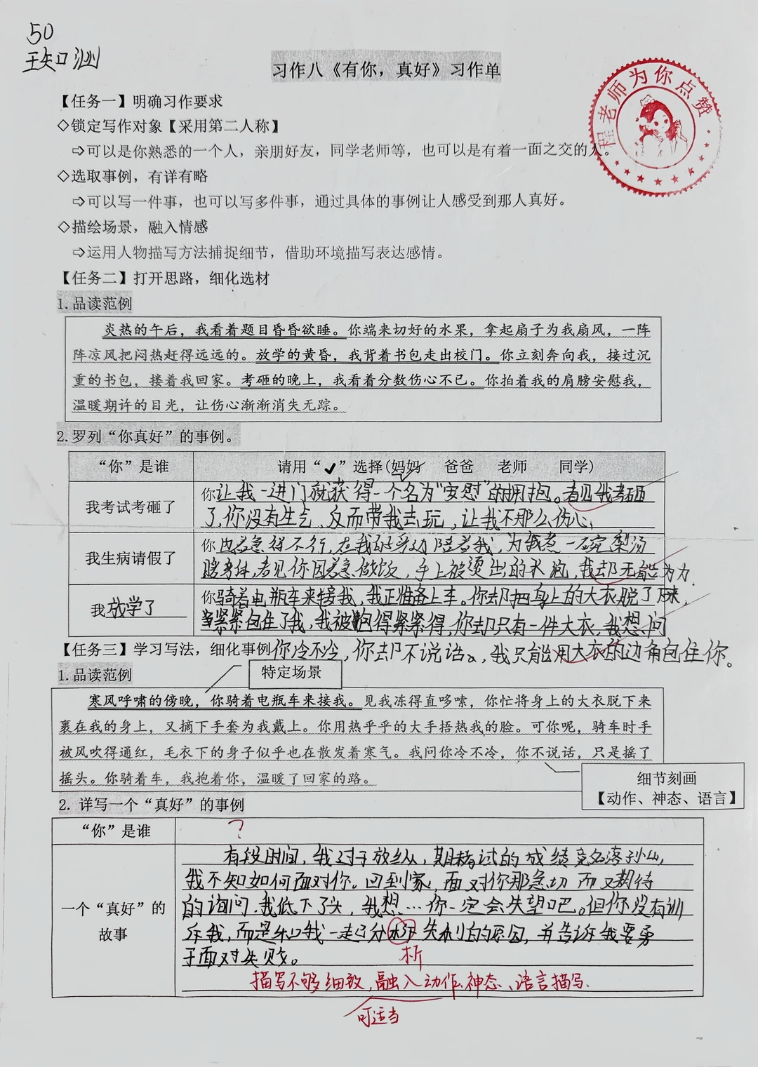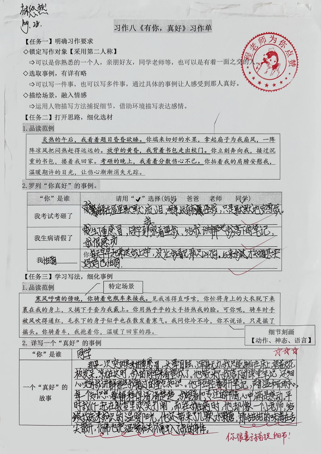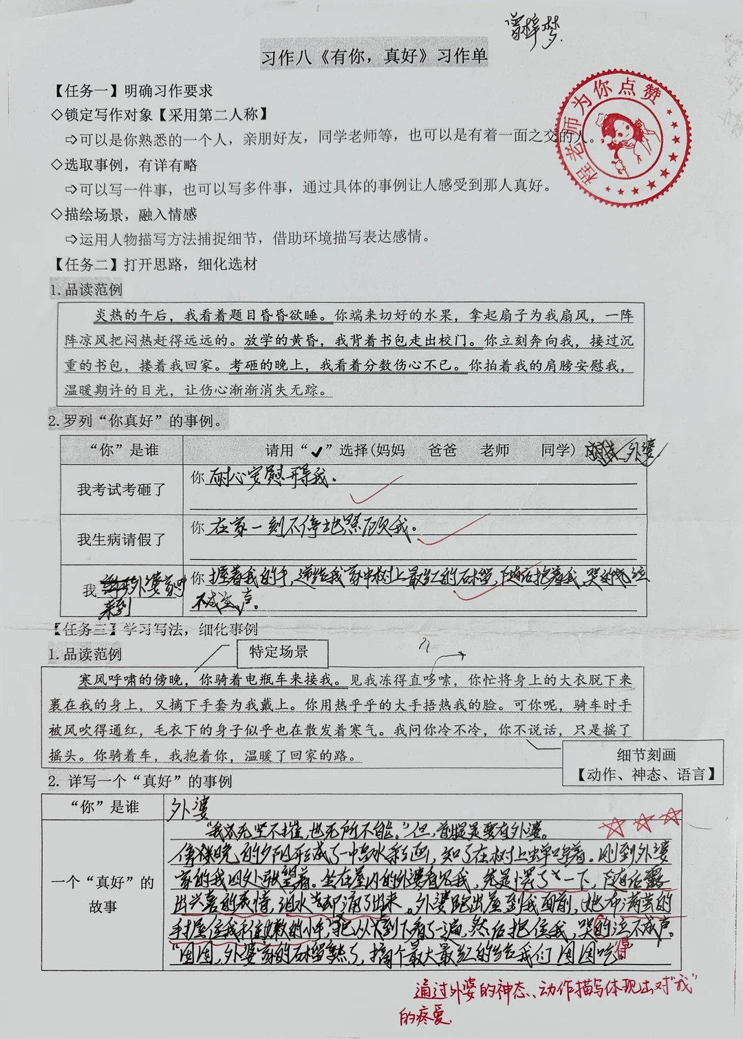 这个次的习作要避免“假大空”,要把日常中的“俗事”写出细节,写出温度。 [一R]明确习作要求: ①锁定写作对象(采用第二人称) ②选区事例,有详有略 ③描绘场景,融入感情 [二R]写作小妙招: 1.抓住细节(运用动作、语言、神态等多种描写方式突出他的特点) 2.融入感情👇 ①可以直接抒情 ②借助环境描写表达感情 ③叙事中,抓住感动的瞬间表达感情