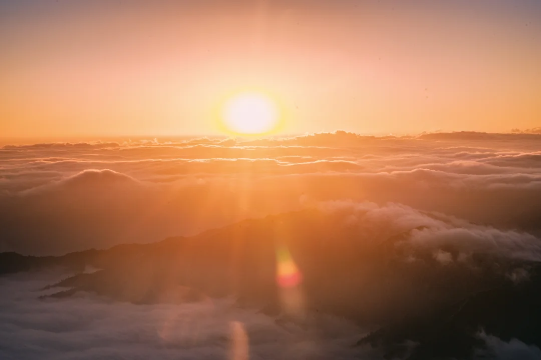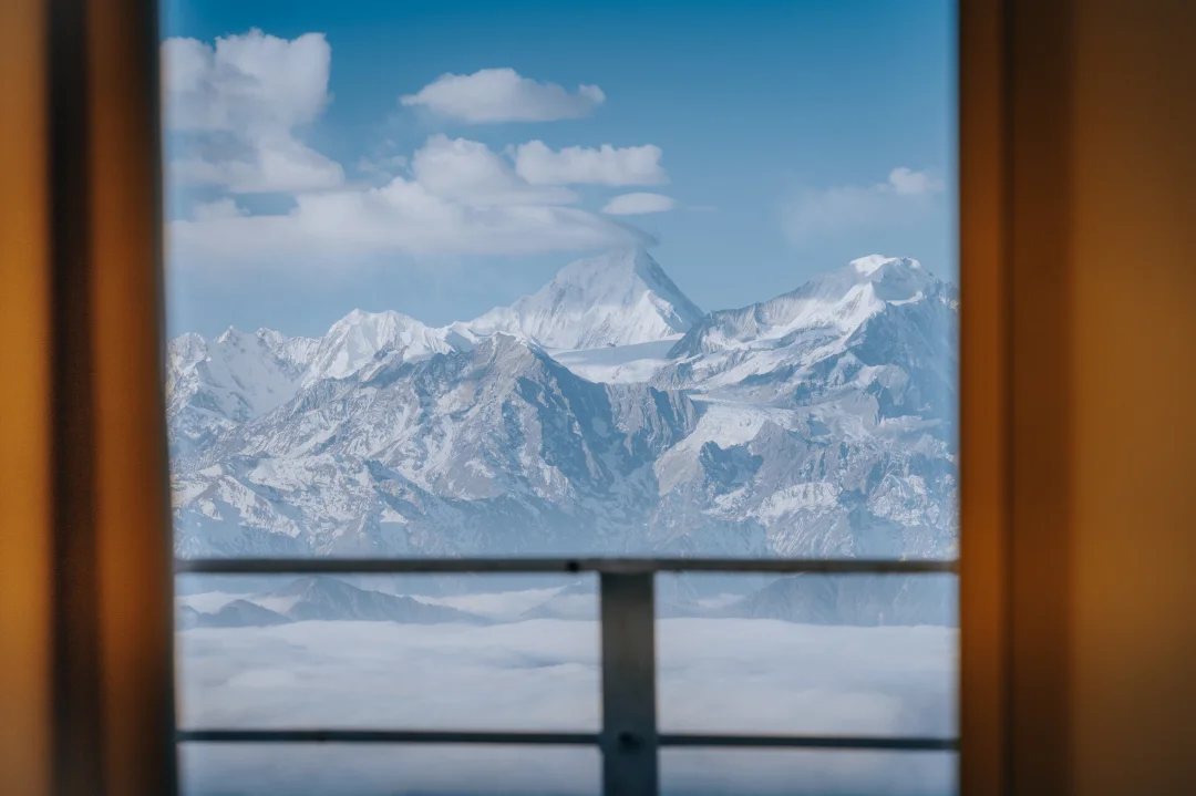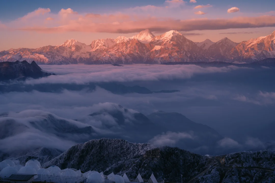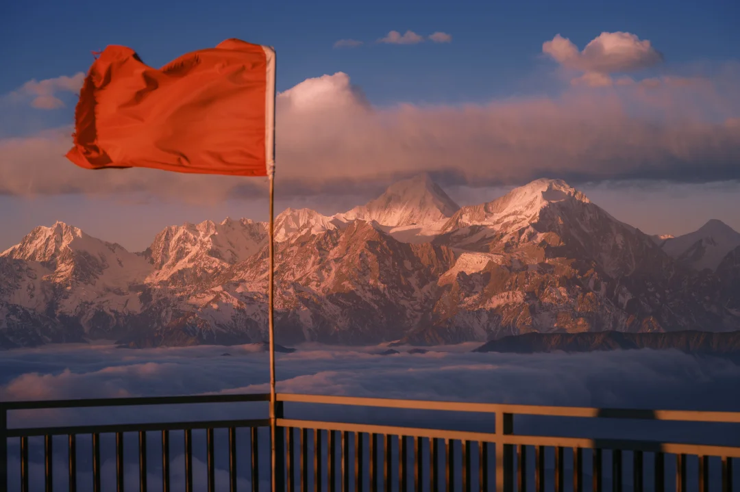 它被誉为亚洲最大的360度观景台,也不是浪得虚名。它的每一面,都能构成独立的景观,左边太阳从云海中浮出,右边的雪山就在同一时间被染红。搞得我相机拍了左边,又立马切换到右边,不知道看哪边更好了