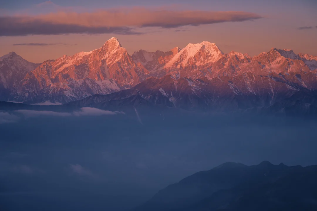 我看过不少贡嘎雪山的观景平台,牛背山的美在我心中算是数一数二。它虽然没有贡嘎西坡某些垭口近距离的震撼,但由于得天独厚的位置,它的前景是我们内地常见的、层峦叠嶂的群山,配上它的王牌【云海、云瀑】,就让它的景色层次和组合,远比贡嘎西坡丰富而温柔