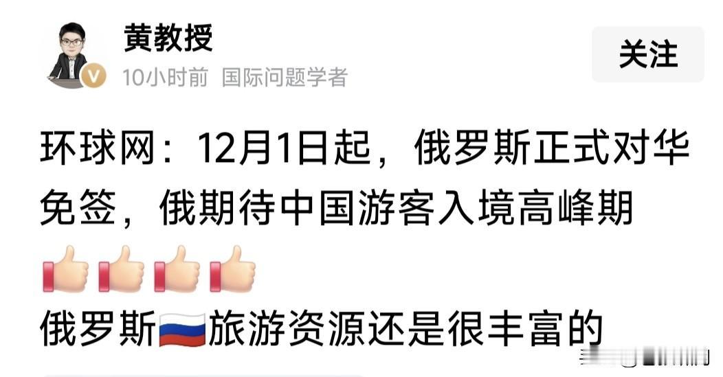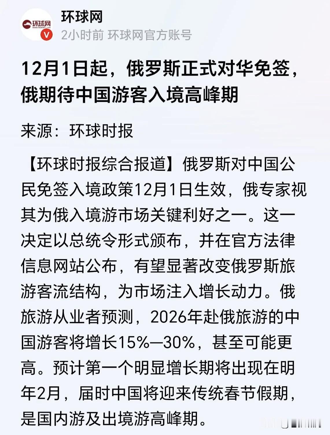 12.1日起俄对中国人免签,期望能够激活俄旅游业,为其经济注入活力。目前已有中国游客赴俄旅游,图片中就有两名中国美女,喜游莫斯科红场。 俄媒预测2026.2月,将是中国游客赴俄旅游高峰!因为此时是中国传统节日春节,有国人可能会利用俄免签机会,去俄领略俄罗斯异国情调风光? 小黄教授发文称:俄对中国游客高峰期很期待,俄的旅游资源很丰富。此前不断有报道,说有中国人去海参崴游览。海参崴也算是一处著名景点吧? …………