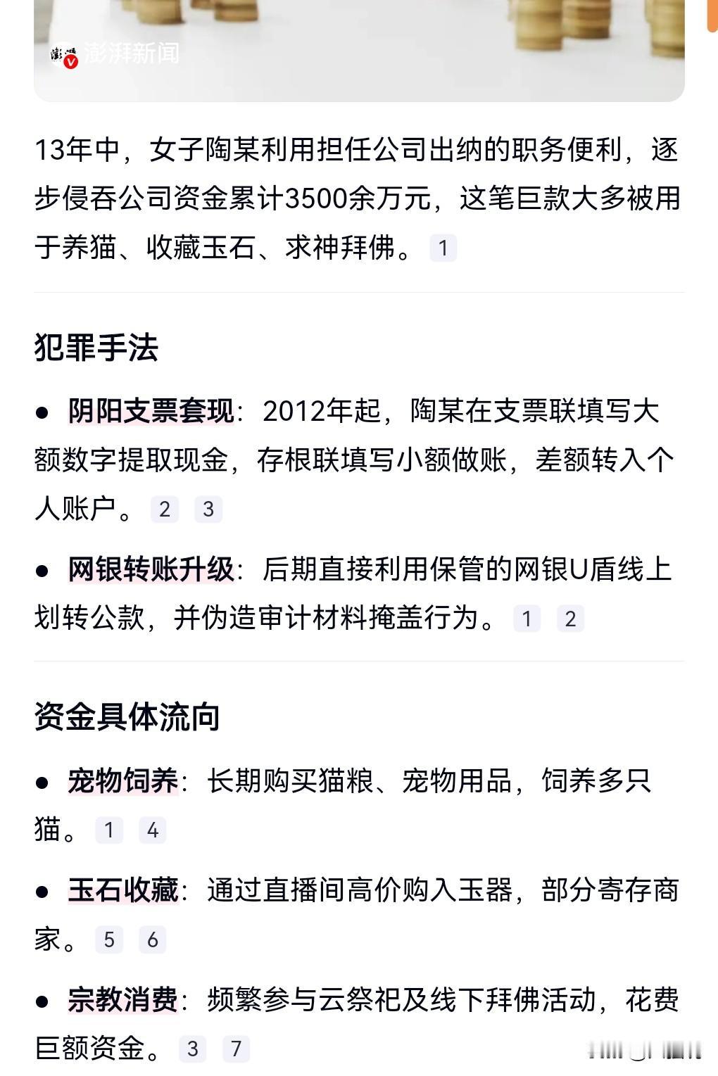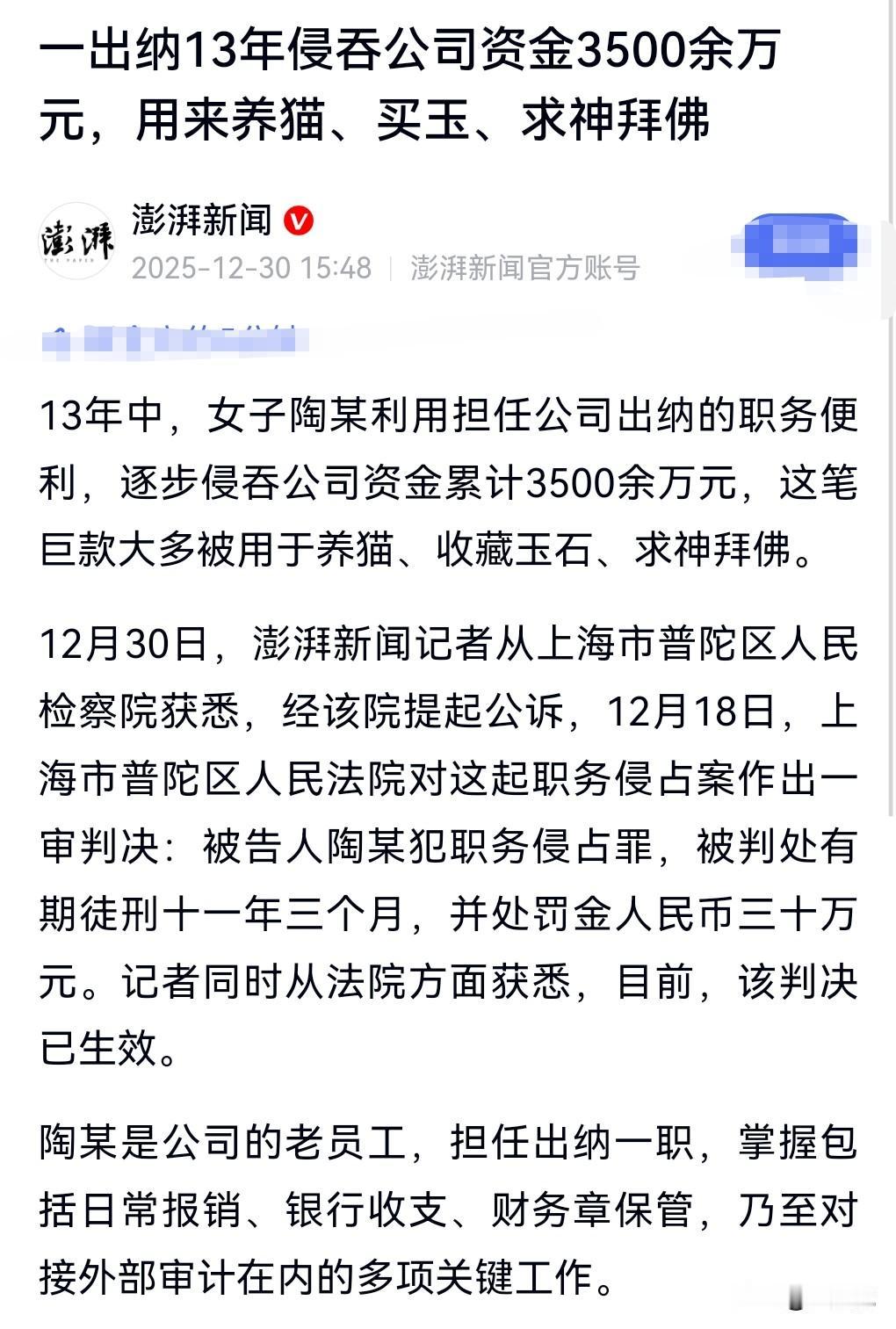 这真是防不胜防啊。 出纳的人品一定要过关啊。 公司出纳侵吞3500余万,用来养猫、买玉,还参加迷信活动。 被骗了很多的钱。 如果求神拜佛有用的话,那还要努力干什么? 这真的是太悲哀了。 让人奇怪的是,贪了这么多的钱,那也没判多少年,才判10多年。 这可是几千万,才判11年多,违法成本太低了。