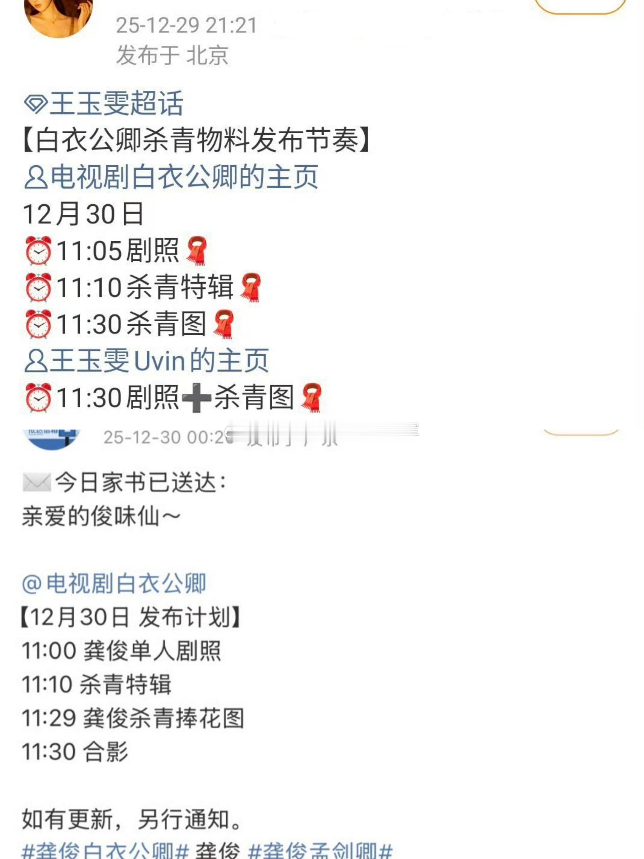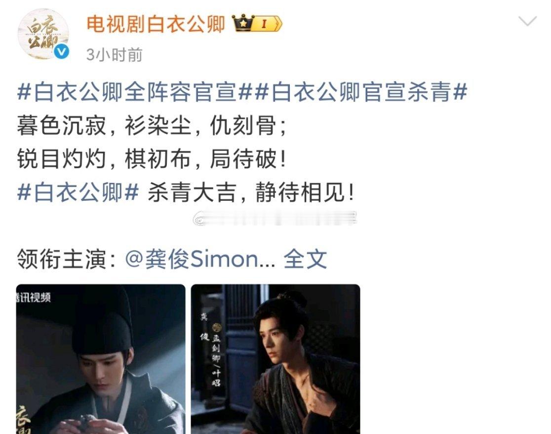 《白衣公卿》原计划应该是给龚俊单发一条,再给其他主演合起来发一条,但是单看图1还以为这是王玉雯的一番大女主剧呢再加上王姐对接提前好几个小时预告物料发布节奏,俊子家感觉膈应也正常。王玉雯白衣公卿物料通知时间白衣公卿杀青特辑