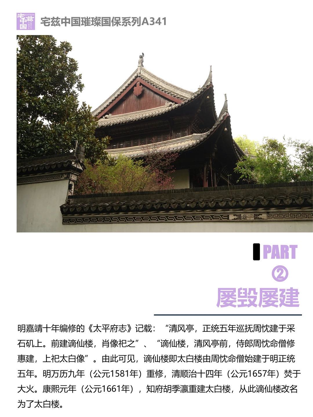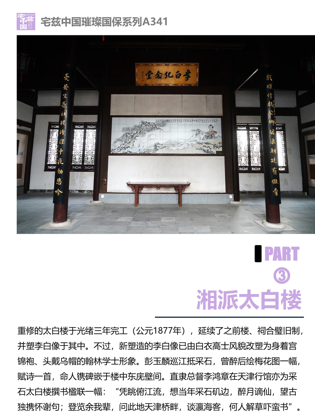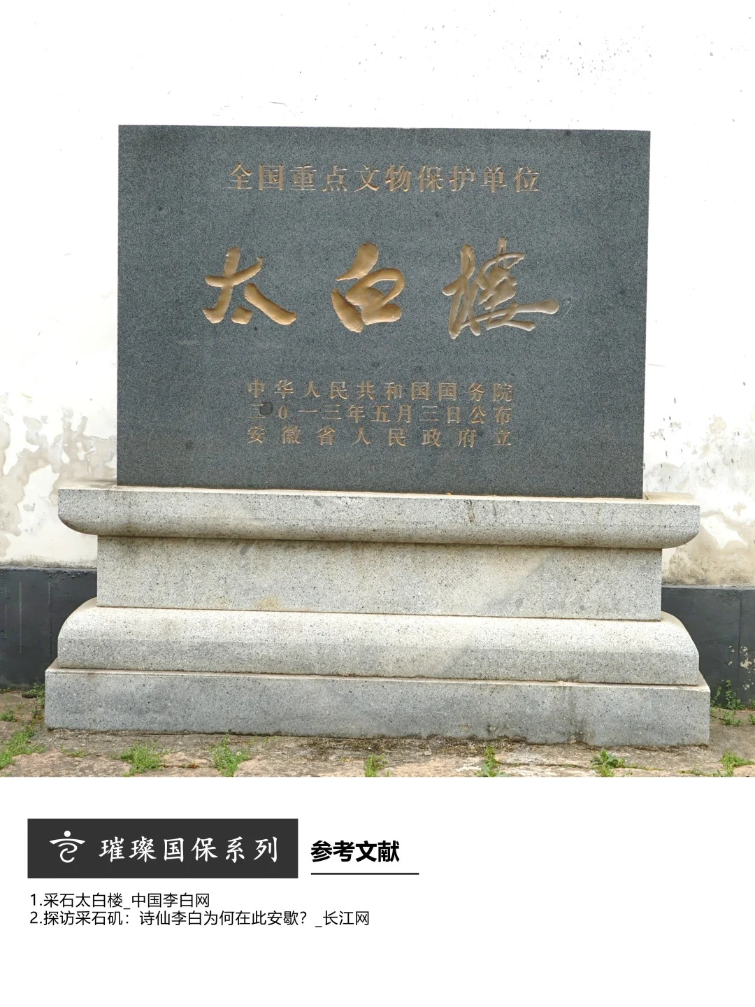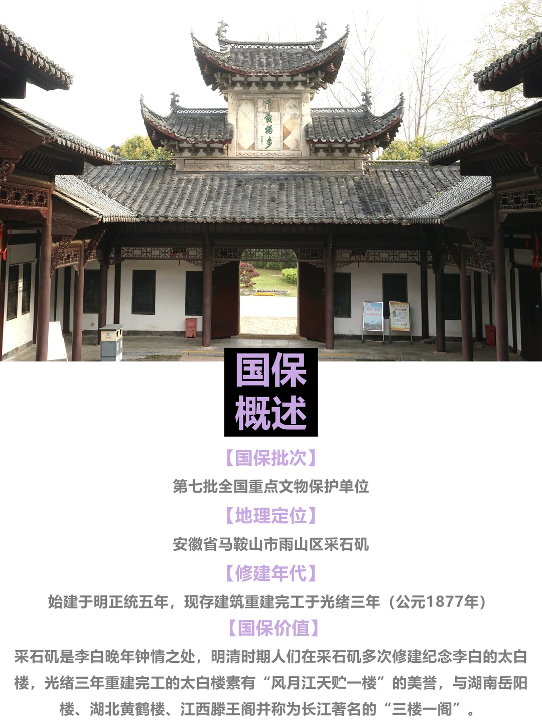 采石矶作为李白晚年在当涂期间喜爱前来游玩饮酒吟诗的地方,人们为了纪念李白,修建了李白楼。根据资料记载,太白楼原名谪仙楼,始建于唐元和间建,但缺乏考证。太白楼历史上多次损毁重建,现存太白楼重建于光绪元年,兵部侍郎彭玉麟、直隶总督李鸿章、安徽巡抚裕禄捐资重建,延续了康熙年间重建时楼、祠合璧旧制。采石矶的太白楼素有“风月江天贮一楼”的美誉,与湖南岳阳楼、湖北黄鹤楼、江西滕王阁并称为长江著名的“三楼一阁”。