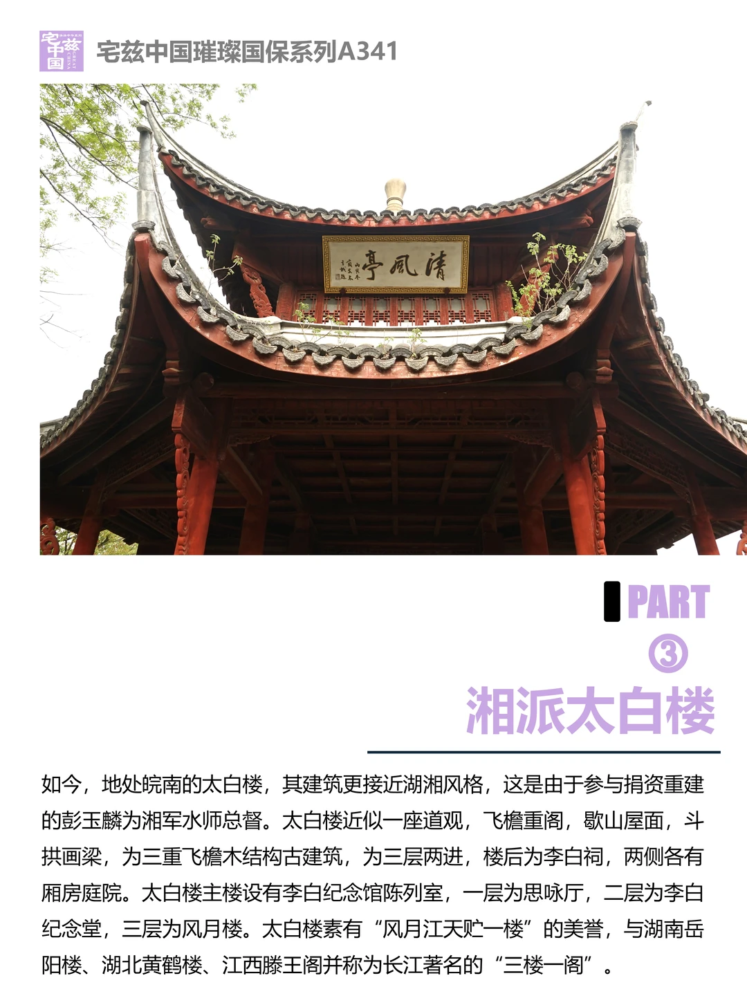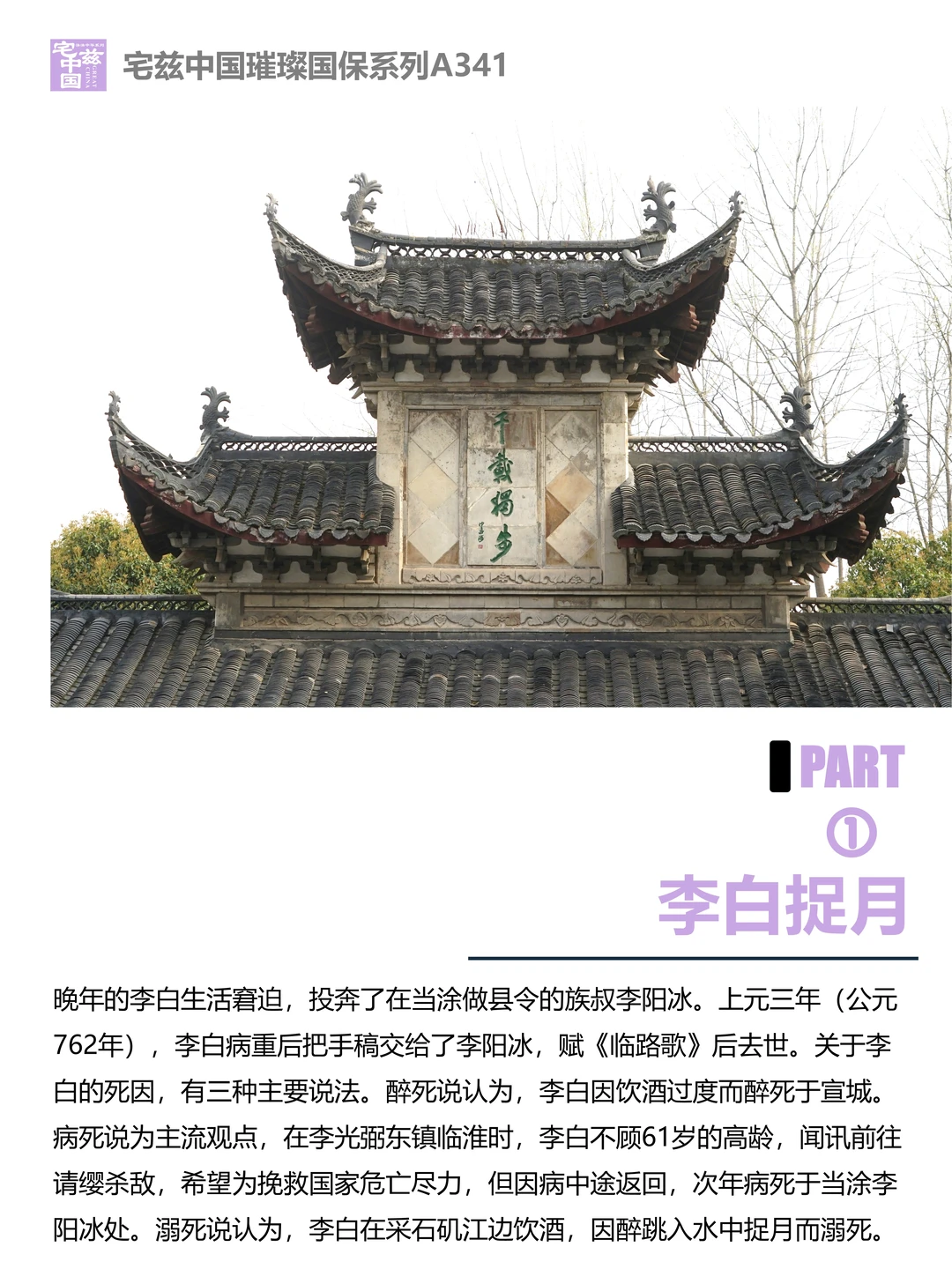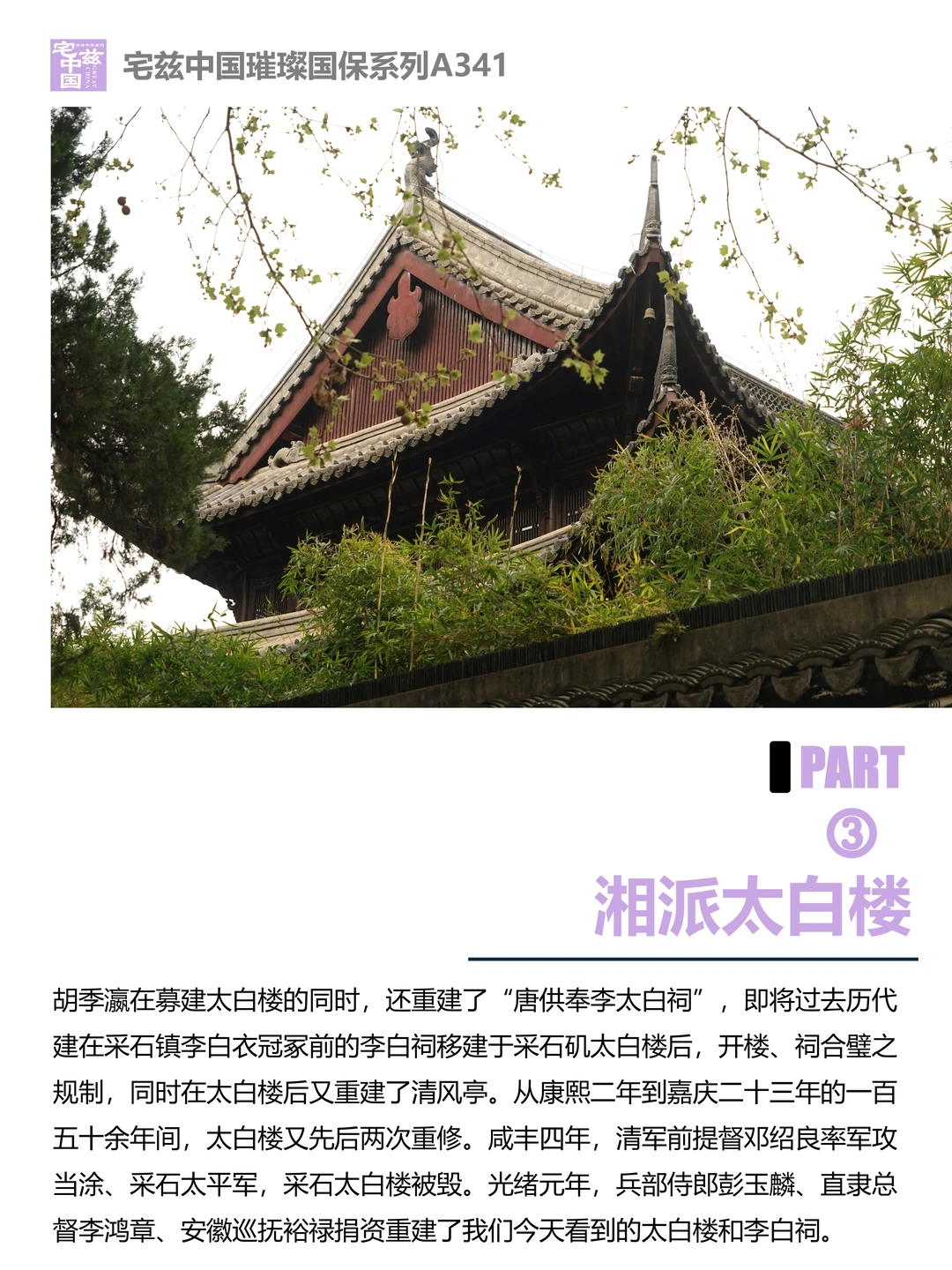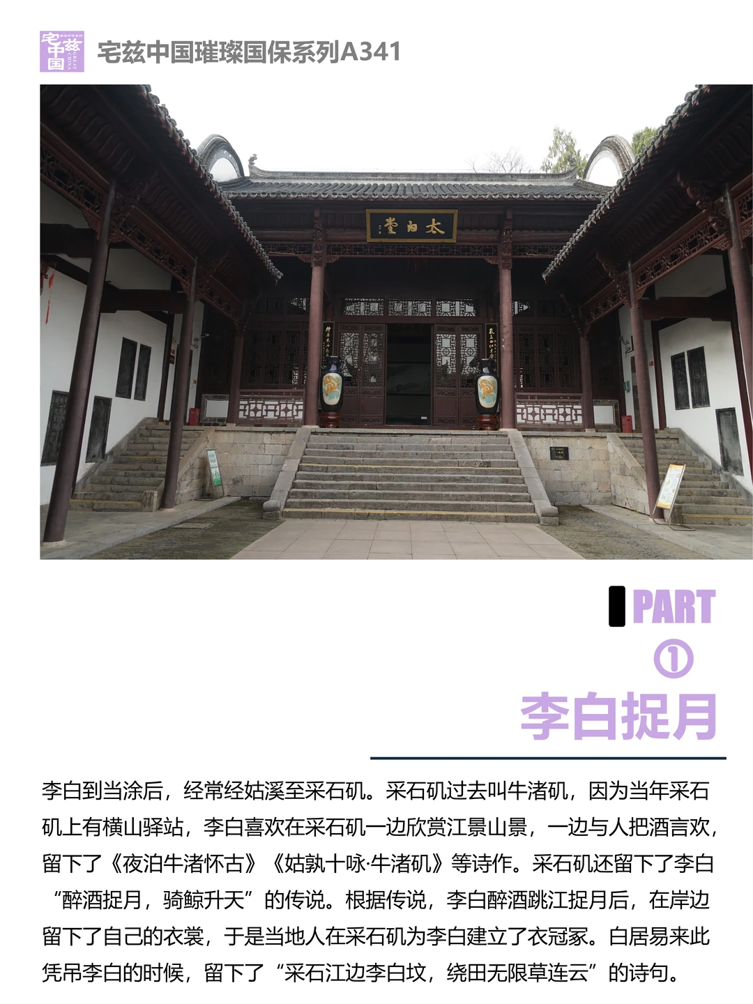采石矶作为李白晚年在当涂期间喜爱前来游玩饮酒吟诗的地方,人们为了纪念李白,修建了李白楼。根据资料记载,太白楼原名谪仙楼,始建于唐元和间建,但缺乏考证。太白楼历史上多次损毁重建,现存太白楼重建于光绪元年,兵部侍郎彭玉麟、直隶总督李鸿章、安徽巡抚裕禄捐资重建,延续了康熙年间重建时楼、祠合璧旧制。采石矶的太白楼素有“风月江天贮一楼”的美誉,与湖南岳阳楼、湖北黄鹤楼、江西滕王阁并称为长江著名的“三楼一阁”。