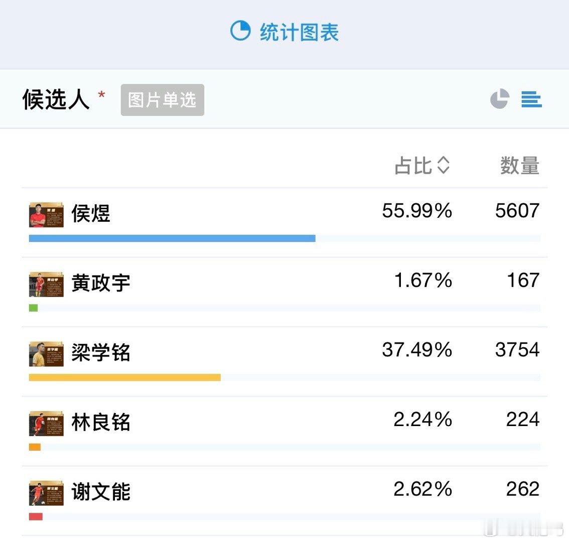 目前领先2000多票,超过一半的支持率,应该还是稳的吧……请大家继续支持侯煜,竞技状态或许有起伏,但要说人气,广州仔候煜必须继续领先,拿下广东足球先生实至名归鸣聊体育广州队
