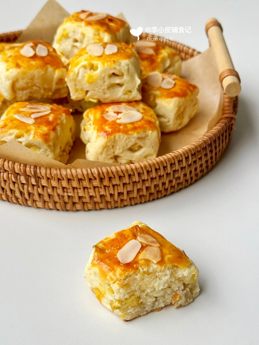 🍪司康:低筋面粉200g、酵母2g、黄油50g、奶粉15g、牛奶80g、蛋黄液、杏仁片