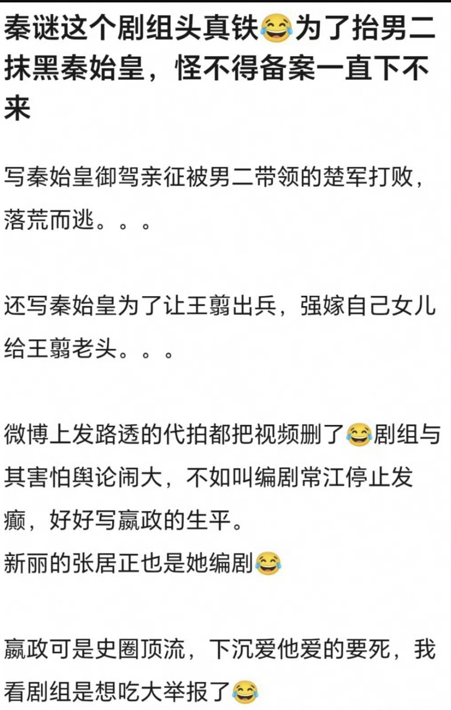 我早就说过秦谜这个剧组,编剧和剧组别瞎搞了,秦始皇现如今的声望,已经不是张鲁一拍秦始皇的那个年代了,就那段时间张鲁一也被骂的狗血淋头。