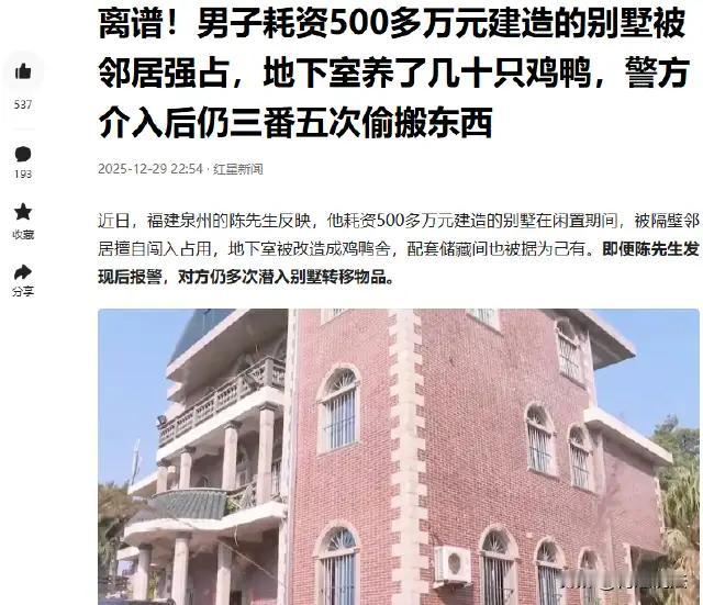 福建泉州,冬至时节,陈先生一家打算回老家祖宅别墅祭祖,可还没推开别墅大门,就闻到刺鼻鸡鸭屎味,打开门一看,地下室竟养了四五十只鸡鸭,现场脏乱不堪,储藏室也被占用还换了锁。陈先生花500多万建的别墅,竟被邻居如此糟蹋,他马上报了警,可邻居还偷偷搬东西,陈先生一家又气又闹心。 (来源:红星新闻) 这不只是一场邻里纠纷,更像是一面镜子,折射出我们社会中一些令人心碎的现实:法律的盲点、道德的缺失,以及人性中那些阴暗的角落。陈先生一家带着对故乡的深厚情感,满怀期待地回到自己花费数年心血打造的别墅,却迎来了一场“家门口的噩梦”。他们的梦想变成了失望,期待变成了愤怒。 当你打开那扇门,迎面而来的不再是熟悉的家乡味道,而是刺鼻的鸡鸭屎味,令人窒息的脏乱场景。那地下室里堆满了鸡鸭粪便、废弃的杂物,仿佛一座荒废的“畜舍”。储藏室被占用,换了锁,仿佛有人在用“非法占有”践踏着法律的底线。这一切,让人不禁质问:我们这个社会,到底怎么了?底线在哪?道德在哪里? 有人会说:这是极端的自私,是“只顾自己”的表现。但细细想来,这背后隐藏的,或许是我们这个社会某些角落的“价值迷失”。在利益面前,有些人竟然可以无视法律、无视道德,只为一己之私。甚至在陈先生报警后,邻居还偷偷搬东西、换锁,试图掩盖自己的“肆意侵占”。这不禁让人愤怒:难道法律的威慑力已经变得如此脆弱?那些“肆意妄为”的人,究竟还要闹到什么地步,才能让他们心生敬畏? 这场冲突,实际上折射出的是我们社会中“信任”的危机。信任,是家庭、邻里、社会最基本的纽带。一旦信任被破坏,再坚固的关系也会变得脆弱不堪。我们习惯了用“法律”去制约,但更应该用“道德”去守护。陈先生的遭遇,提醒我们:只有法律和道德共同发力,才能真正保护我们的家园和权益。 在这个快节奏、利益至上的社会,少有人愿意静下心来思考:我是否也曾在不经意间侵犯过别人的权益?我们是否也曾忽视了邻里间的微妙关系?当每个人都只顾自己,社会的“和谐”就会变得脆弱不堪。陈先生的故事,实际上是在告诉我们:守住底线,尊重他人,是每个人应尽的责任。 答案其实很简单:从自己做起,从点滴做起。我们要学会尊重规则,尊重他人的劳动成果。我们要用善意去沟通,用法律去维护权益。更重要的是,要有勇气站出来,为自己发声,为正义发声。 只有当我们每个人都行动起来,社会的底线才不会被轻易突破。陈先生的遭遇,或许只是个别,但它提醒我们:我们每个人都是社会的守门人。 在这个冬至时节,让我们不只是祭拜祖先,更要祭拜那份对正义、对规则的敬畏。因为,只有每个人都守住底线,社会的未来才能更加光明。 你我他,都是这个社会的一份子。让我们共同努力,让“家”的意义不再被践踏,让那份温暖永远在心中燃烧。因为,只有守住底线,社会才能走得更远、更稳。