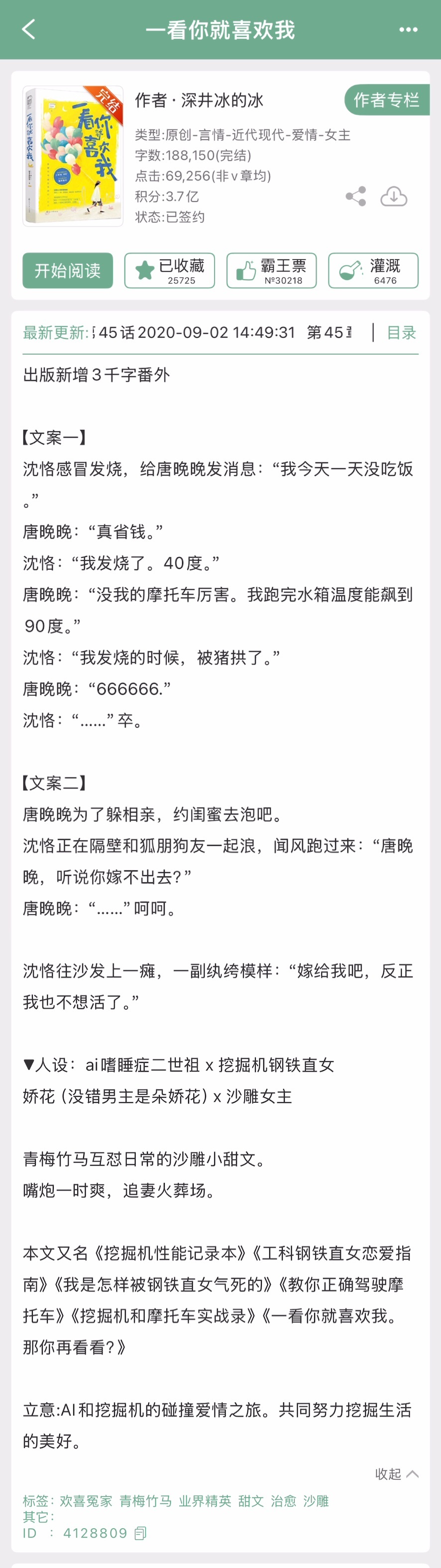 《一看你就喜欢我》作者深井冰的冰▫️唐晚晚x沈恪▫️青梅竹马/沙雕小甜文钢铁直女主x嗜睡症男主男女主小时候是住对门的邻居,男主暗恋女主很多年,他高二之后出国了,和女主分开十多年,一直没联系是因为男主突然患上了嗜睡症,不敢联系女主。直到十多年后回国后重遇女主,就又搬回了女主对门住,开始了强撩女主的艰辛过程。无论男主怎么使出浑身解数,女主就是不开窍,完全对不上男主释放的脑电波,男主的每一次撩拨都撞了南墙,心疼男主。虽然男主的主动勾引不奏效,但女主却对着男主满脑子的黄色废料,对,女主其实就是馋男主的身子罢了…还是想心疼男主三秒。女主个铁憨憨最后还是被男主个心机boy引导着去表白了,而女主的表白又非常的不走寻常路,笑料百出。男主还跟女主说自己太好追了,女主个傻女还真的信了!这两个人真的不要太逗!全文都是比较轻快的节凑,一本沙雕小甜文,几乎可以说是全员沙雕,男女主的父母也很好玩!!两家都觉得是自己的猪去拱了别人家的白菜哈哈哈哈~看这文的时候我笑得都快得羊癫疯了!暗恋是男人最好的医美暗恋是男人最好的医美