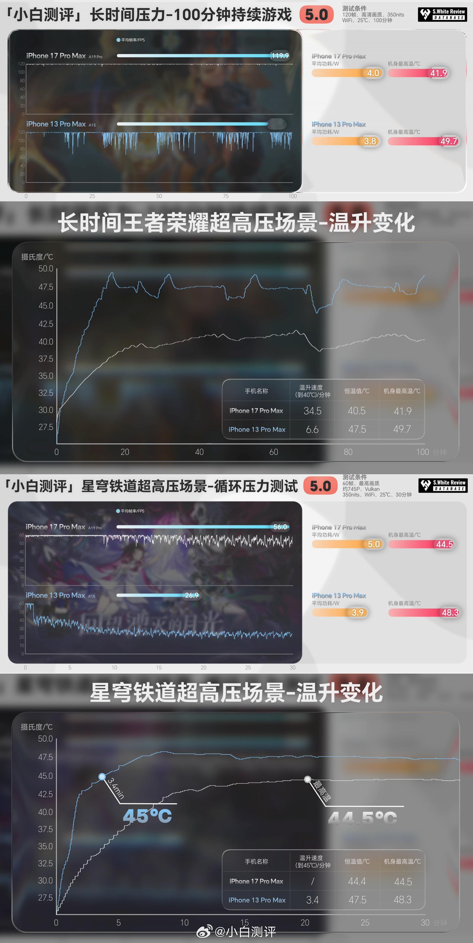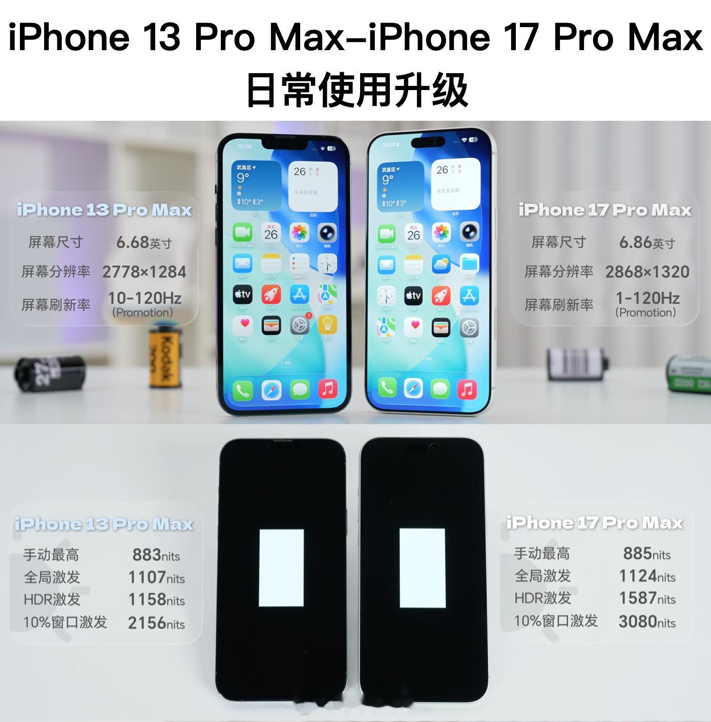 iPhone四年升级了多少 从iPhone 13 Pro Max到iPhone 17 Pro Max,苹果四年都升级了多少?几张图总结下芯片性能、游戏体验、日常使用的实测表现~1、芯片性能:从A15到A19 Pro天梯排名来说,综合提升79.2%,其中GPU升级幅度最大96.2%;2、游戏性能:游戏帧率稳定性和散热表现相差非常明显。(数据详情参考配图)3、日常使用:续航、充电和屏幕HDR激发亮度升级较大,日常应用流畅性两款几乎没有变化。小白测评数据库5.0环境温25℃±0.5℃,屏幕亮度350nits,全新机械臂操作、高速相机进行数据采样
