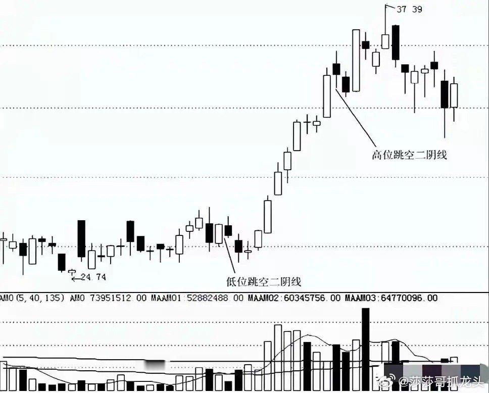 一旦出现“跳空双阴”,就是主力洗盘完毕,散户却看不懂遇到“跳空双阴”,很多朋友的第一反应是“主力跑路了”,吓得赶紧清仓。但莎莎哥要告诉你,一旦看懂了这种形态,我往往会把它当作一个即将起飞的信号,果断关注起来。这个形态经常出现在主升浪开始前,是主力用来吓走散户、清洗筹码的最后一招。如果你总是一看到两根阴线就恐慌割肉,卖完股价就起飞,那今天这篇文章,请你一定要认真看完。那到底什么是“跳空双阴”呢?简单说,它是由连续两根阴线组成的K线组合,关键是这两根阴线之间要有向下的“跳空缺口”。看起来像是下跌趋势猛烈,但实际上,它通常出现在股价一波连续上涨之后,逼近前期高点附近的位置。别被表面的“双阴”吓到,核心在于看懂主力背后的意图。识别“跳空双阴洗盘”的核心要点,主要有以下三条:第一点:形态要出现在关键位置,而且必须“跳空”。真正的洗盘信号,不是随便哪个下跌阶段都会出现的。它要求股价之前已经有过一波明确的上涨,正在挑战前期的高点或者密集成交区。在这个节骨眼上,先出现第一根阴线,紧接着第二天股价直接低开,留下一个缺口,并再次收阴。这个跳空缺口是制造恐慌情绪的关键,会让很多人误以为突破失败、趋势反转。但记住,在上涨趋势中的这种突然“缺口”,往往是假动作。第二点:走势看似吓人,但盘面细节暴露主力底牌。1. “长下影线”是护盘痕迹:这两根阴线,尤其是第二根,最好能带有较长的下影线。这根下影线说明,股价在盘中被打压下去后,有资金在低位悄悄地接了回来,这往往是主力自己在护盘和承接筹码的痕迹。2. “成交量萎缩”是核心证据:洗盘是为了吓人,不是为了真出货。所以,这两天阴线对应的成交量,必须比之前上涨时的阳线成交量要明显缩小。如果成交量反而放大,那就要警惕是否是真正的出货了。缩量表明抛压其实并不重,只是散户在恐慌卖出。把这两天的走势连起来看,主力的意图就很清晰了:先用跳空低开制造恐慌(试盘,测试市场反应),再顺势打压出下影线(洗盘,逼出不坚定筹码)。整个过程以缩量完成,说明筹码锁定良好,为接下来的拉升扫清了障碍。第三点:关注确认信号,把握启动时机。洗盘结束后,主力会迅速行动。关键的观察点就是接下来的第三根K线。· 如果第三天,股价能够上涨并回补掉之前的跳空缺口,这通常是一个明确的启动信号,意味着主力即将开始快速拉升。· 更强势的情况是,第三天直接跳空高开,一举越过前面两根阴线的高点,这往往预示着更猛烈的主升浪甚至连续涨停的可能。所以,以后在上涨趋势中看到“跳空双阴”,先别急着跑。冷静下来,对照上面三点——位置是否关键、是否缩量、是否有下影线。当这些条件都满足,且出现阳线反包确认时,很可能就是行情真正启动的节点。