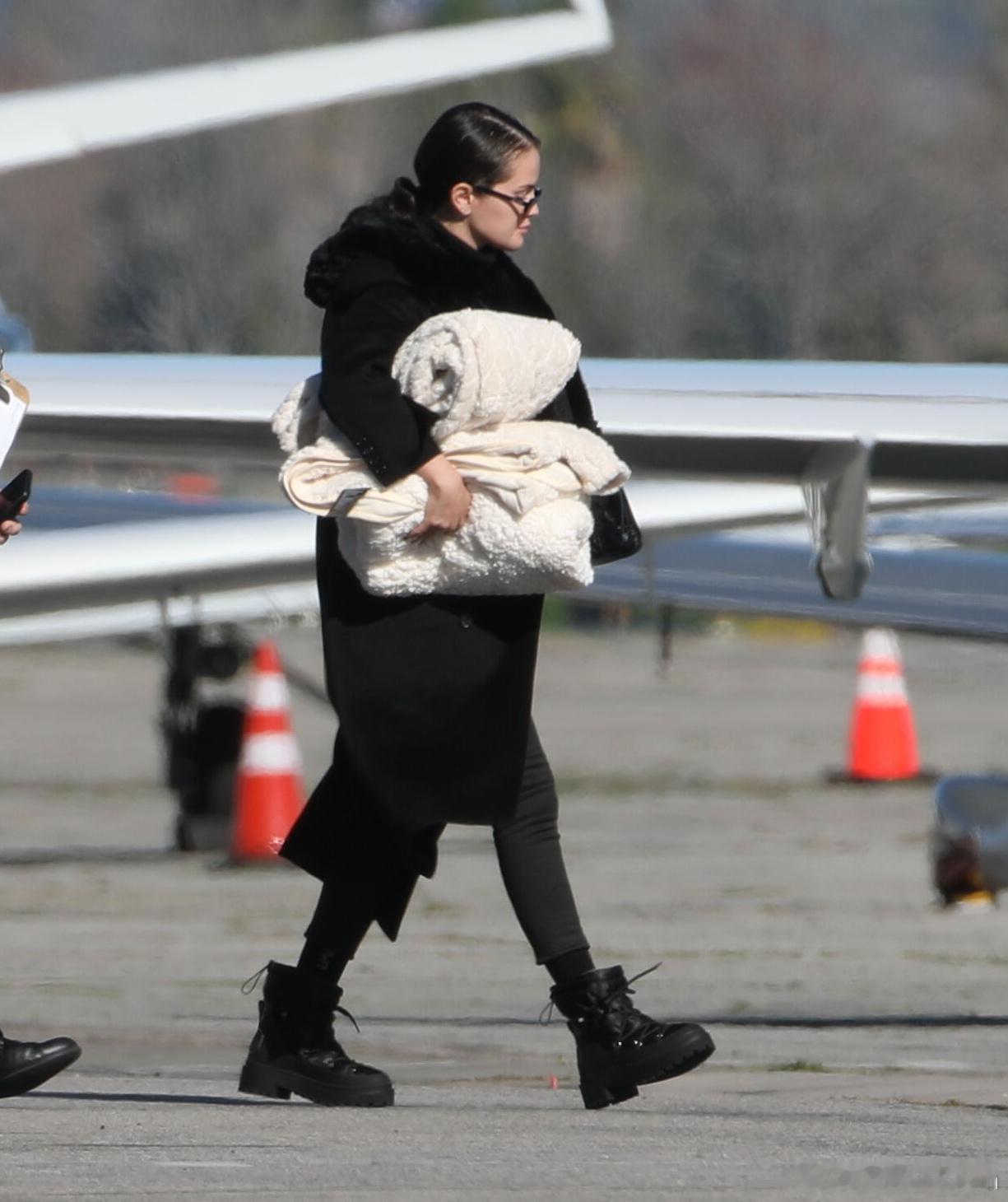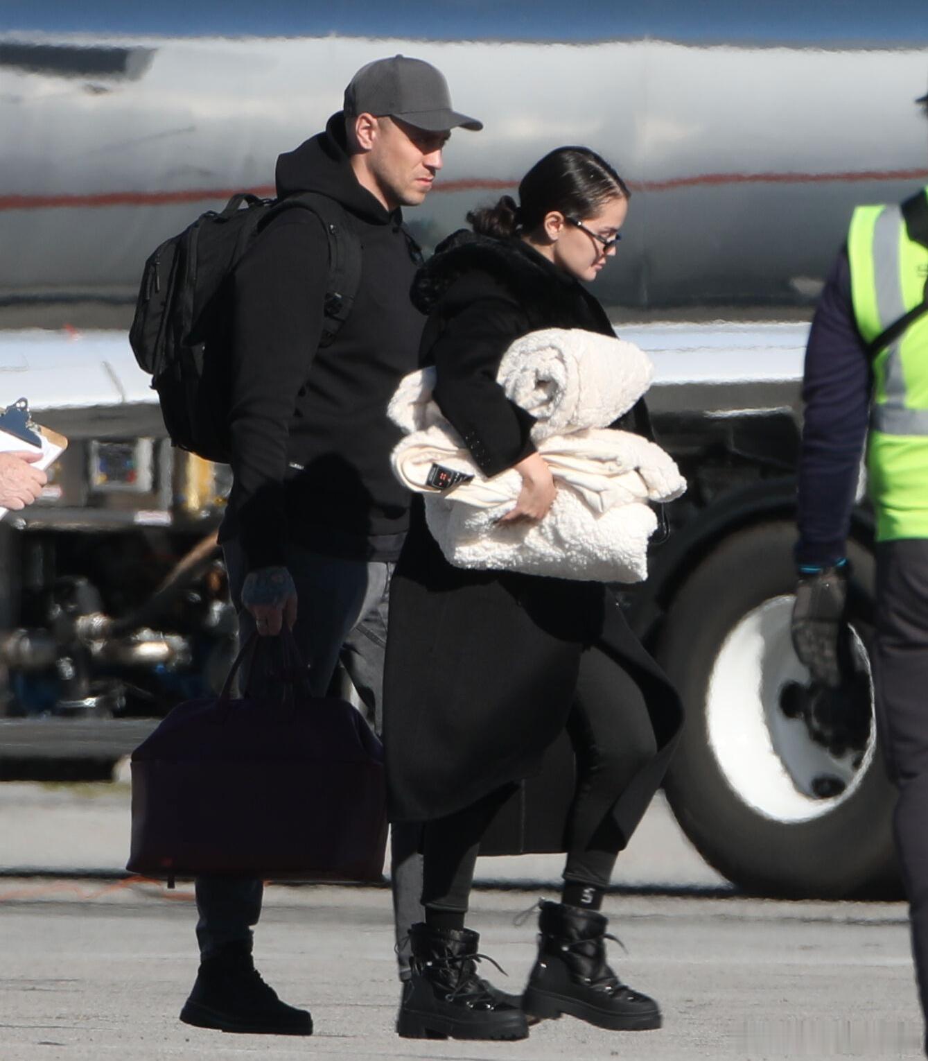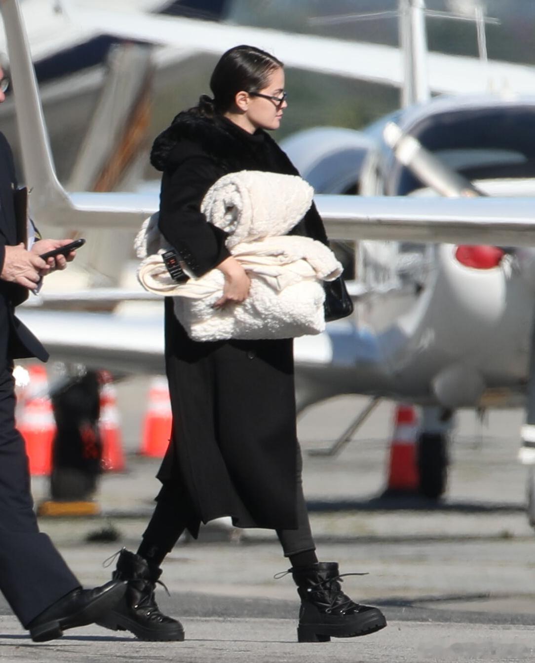 Selena Gomez赛琳娜戈麦斯搭乘私人飞机抵达洛杉矶Van Nuys机场,抱着好几张毯子走下机