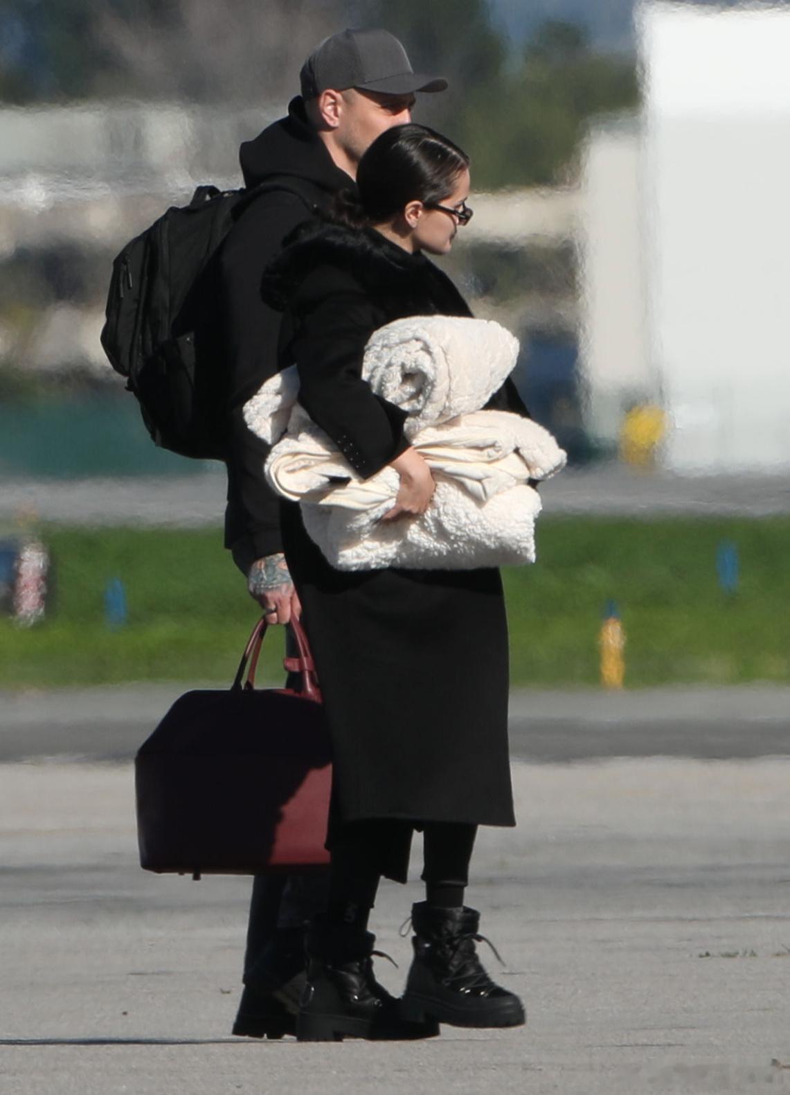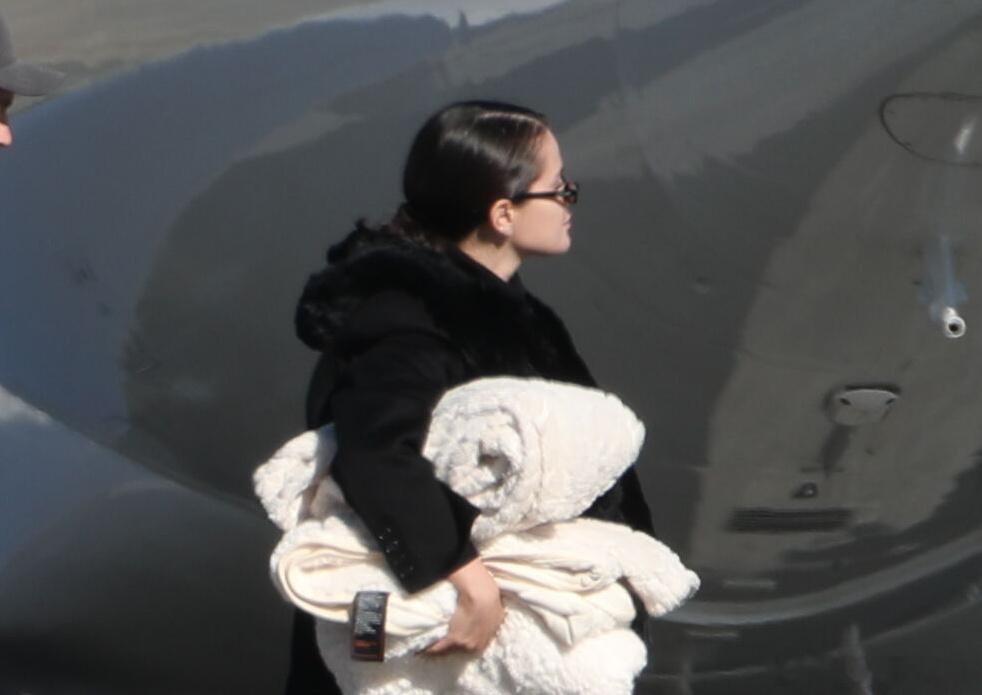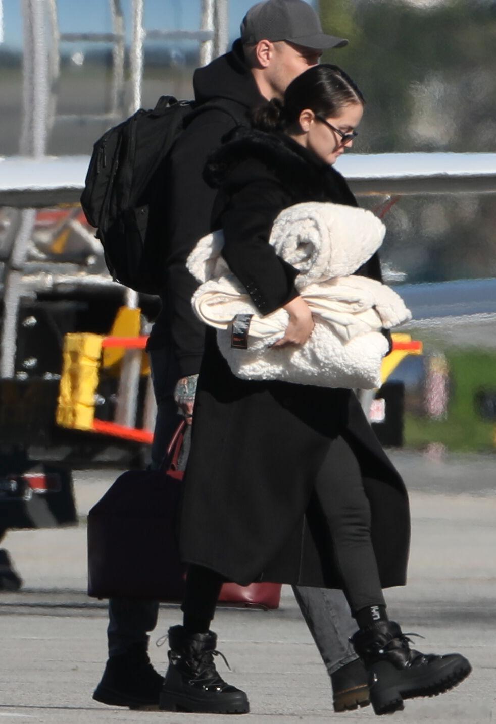 Selena Gomez赛琳娜戈麦斯搭乘私人飞机抵达洛杉矶Van Nuys机场,抱着好几张毯子走下机