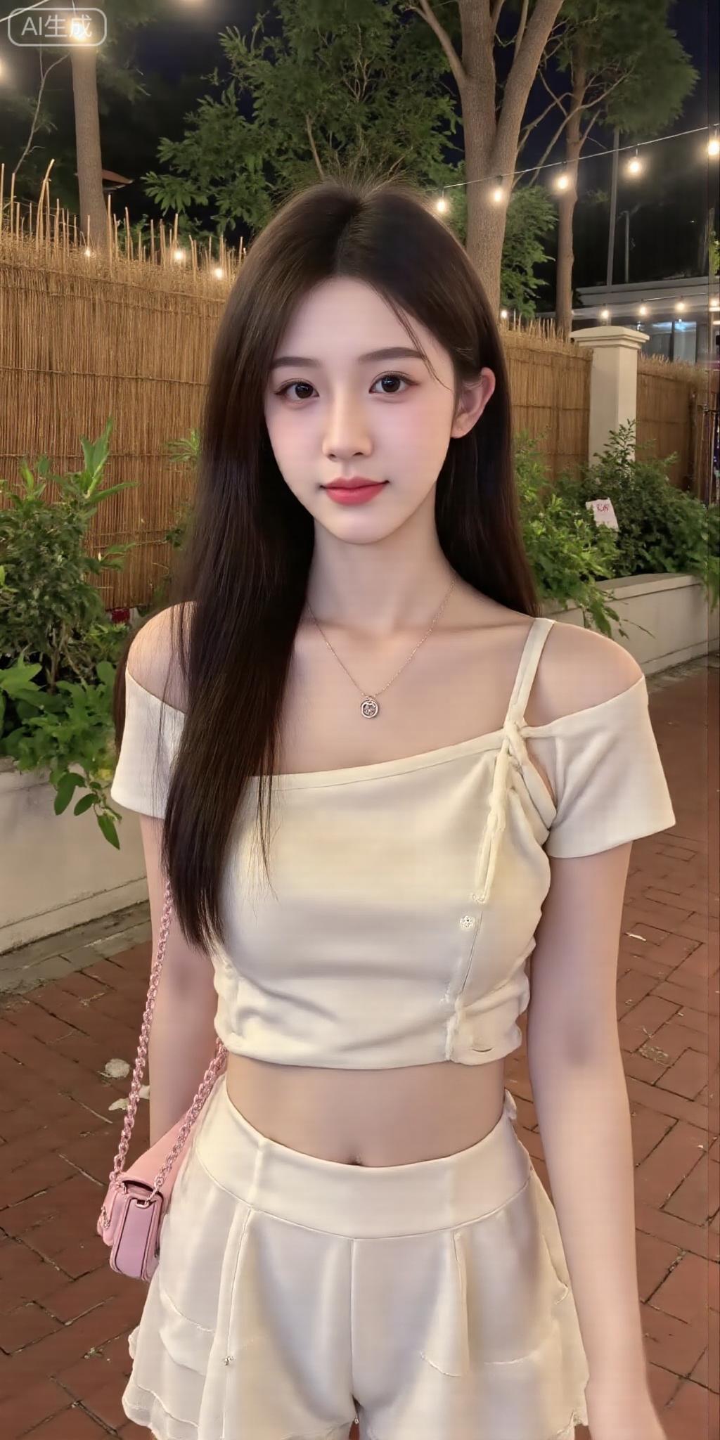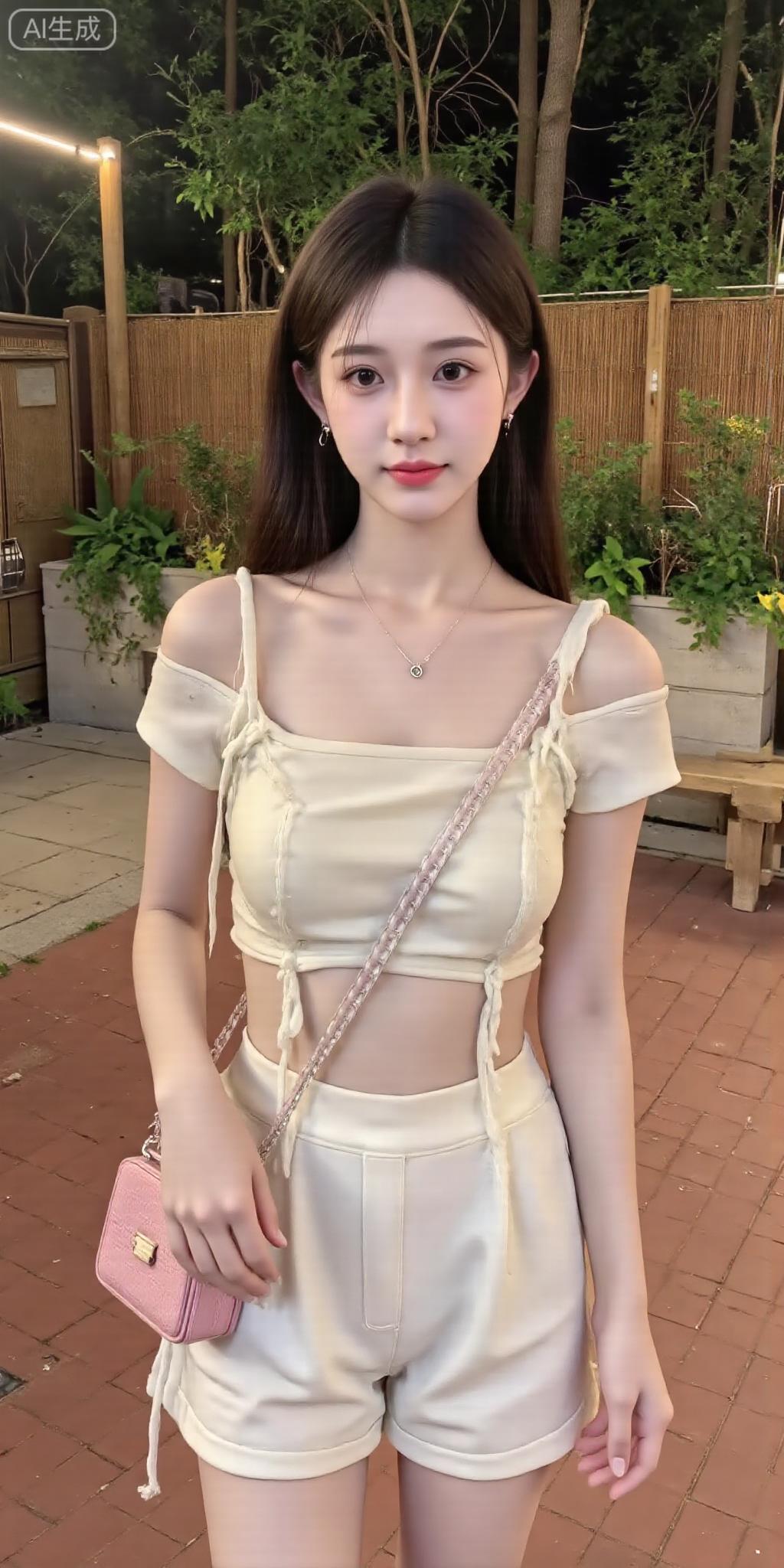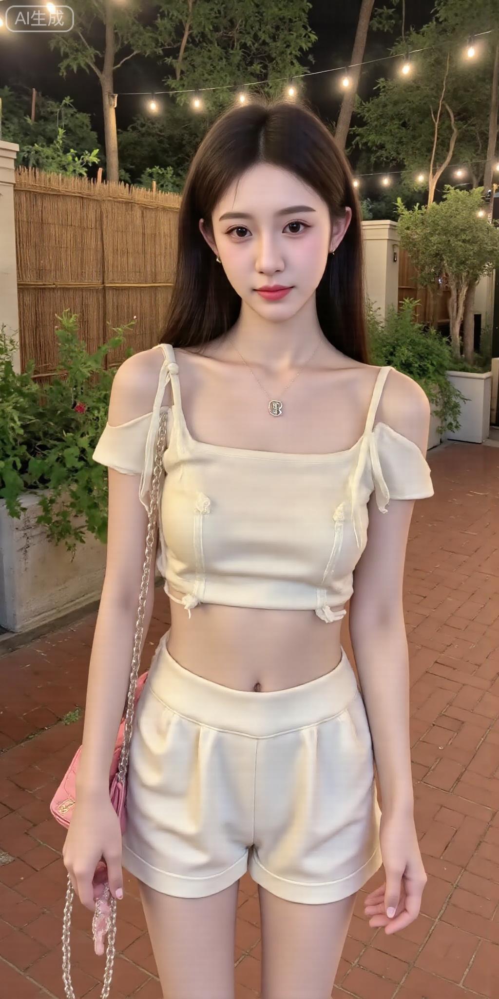 夜巷里的新中式甜美好戳 露肩短款上衣缀着盘扣,配同色系短裤,粉包包一搭,甜里裹着中式柔美感~ 串灯衬着绿意,随便站着都像把夏夜温柔穿身上,这松弛感太绝啦!中式盘扣裙装