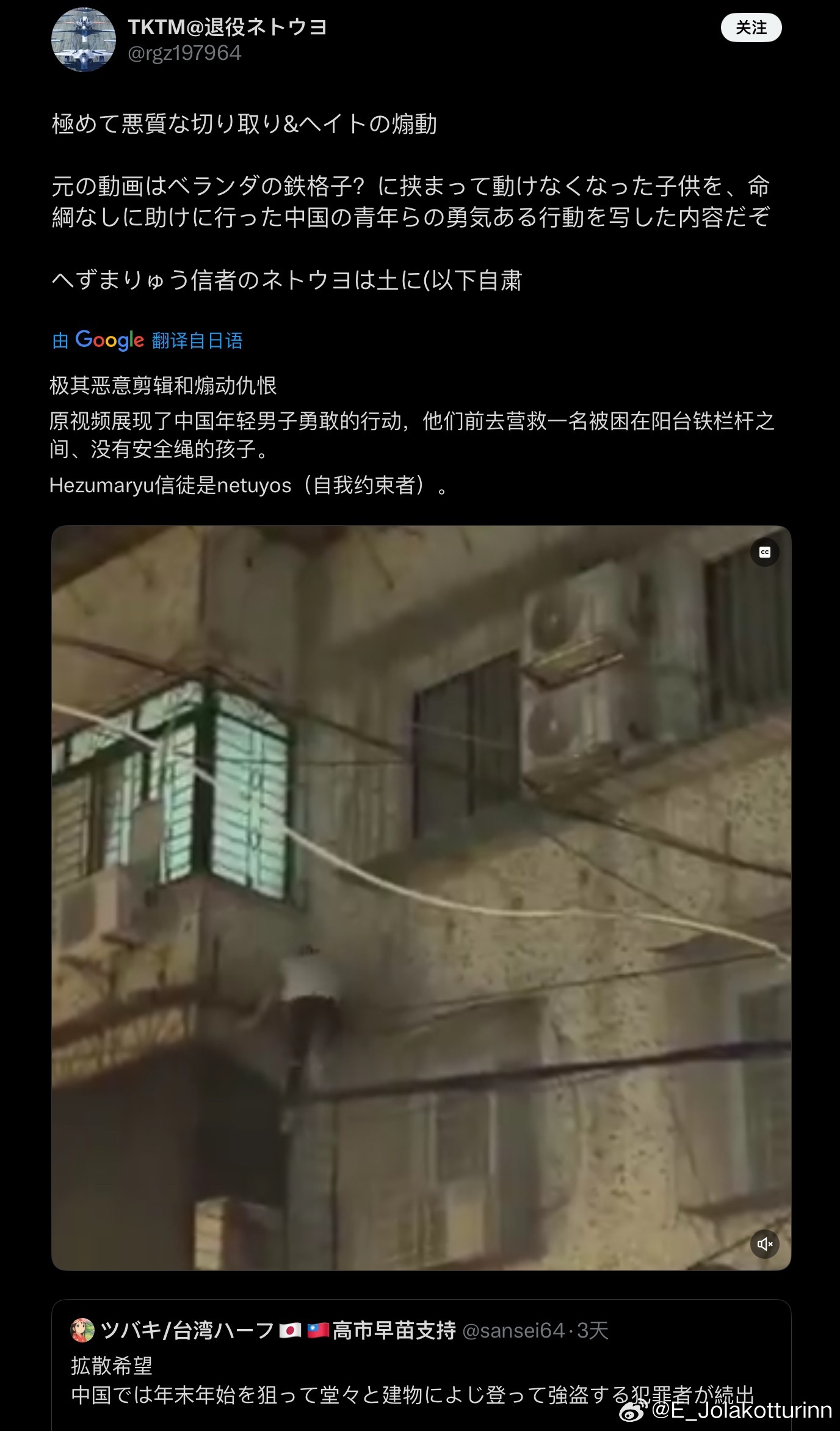年底招笑大赏:自称“台湾日本混血”的蛙蛙造谣中国青年见义勇为拯救孩童的视频,说这是“入室偷窃”,然后被日本网民嫌弃,批评他说抹黑见义勇为实在是毫无廉耻。挂了一大堆“台湾有事就是日本有事”的标签献媚,结果被人家嫌弃的不要不要的。笑晕。