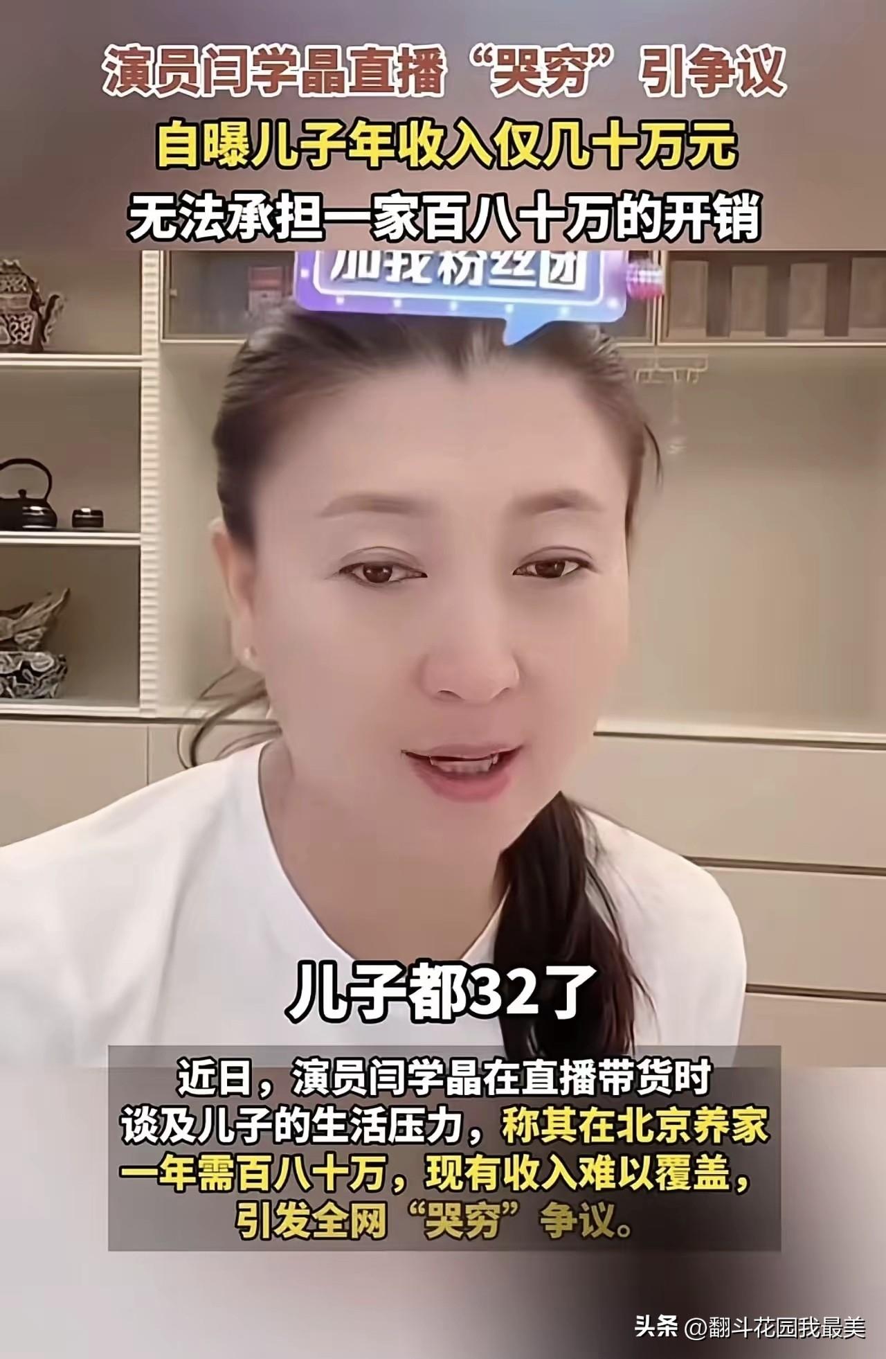 闫学晶直播哭穷这次争议可不小呀!! 儿子年入几十万仍嫌少, 刷到闫学晶直播诉苦的视频,才算真正见识到人与人之间的鸿沟。这位小品舞台上的熟面孔直言,30多岁的儿子成家生子后,全家一年开销要百八十万才能撑住。可儿子一年也就拍一部戏,挣个几十万,儿媳做音乐剧演员,收入更是微薄。 这番话一出,全网瞬间炸开了锅。在普通人眼里,年入几十万已经是遥不可及的天花板,没想到到了她口中,竟成了入不敷出的烦恼。真的是差距呀! 本以为是真的经济拮据,结果不过是“燕窝断供”式的焦虑。这下算是彻底懂了,人和人之间的差距,真的不止一星半点。大家觉得呢?