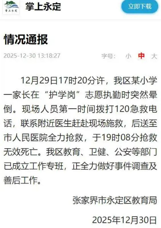 湖北张家界,一名45岁家长在学校门口护岗时突然晕倒,送到医院抢救后身亡。 他家