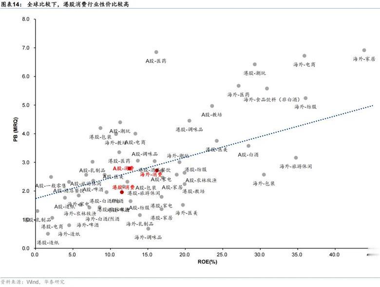 由于许多中国优质企业在A/H两地上市,所以即使你只投资A股标的,港股的行业估值也是不得不考虑一下的因素:一方面,A/H之间的折溢价短期可能有偏离,长期均会围绕合理折溢价中枢去波动;另一方面,H股更多可以看出纯境外投资者对于一些企业和行业的看法(虽然有少数南向通的交易)。 附图1是截至上周港股各行业PE及相对估值分位数情况,从这一点来看,我依然坚持自己此前半年的观点,银行股当下难有系统性机会,看看港股银行的估值已经在85%分位了,拔估值的空间并不大,而作为A股银行业风向标的国有大行均两地上市,这家制约A股银行的上涨空间。 附图2是A/H股消费行业PB-ROE关系图,一般而言高ROE需给予高PB估值,通过对A股、港股、海外三个市场同样行业的PB-ROE比较,找出性价比的资产大类也是我们常用的估值方法,在横线下方的行业代表着配置性价比(当然这只是PB-ROE关系角度,实际要考虑的更多),在此一并给大家科普一下。