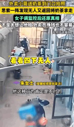 万万没想到。安徽合肥的朱女士点了一杯奶茶,订单显示送达后,她就让孩子去门口取。结果孩子说门口没有。 朱女士说,不可能呀,外卖员送到门口后,还给我拍下了照片。她怀疑孩子是不是偷偷的自己喝了。 而孩子则坚定的说自己没看到奶茶。 朱女士就怀疑是邻居拿走了。因为之前也发生过丢外卖的事情,所以她这次想一定要查清楚到底是谁拿了自己的外卖。 恰好,不远处有一个摄像头能拍到朱女士家门口。她就找物业要了监控视频。 万万没想到的是,这个外卖不是别人拿的,而且外卖员自己拿走了。 原来,外卖员给朱女士拍照片后,又返回去把外卖拿走了。 看到这一幕,朱女士表示很纠结,要不要找到这个外卖员索赔呢。 因为她觉得外卖员挣钱不容易,思来想去还是不想让他赔了。 朱女士是个心地善良的人。但这个外卖员的行为却很让人气愤。
